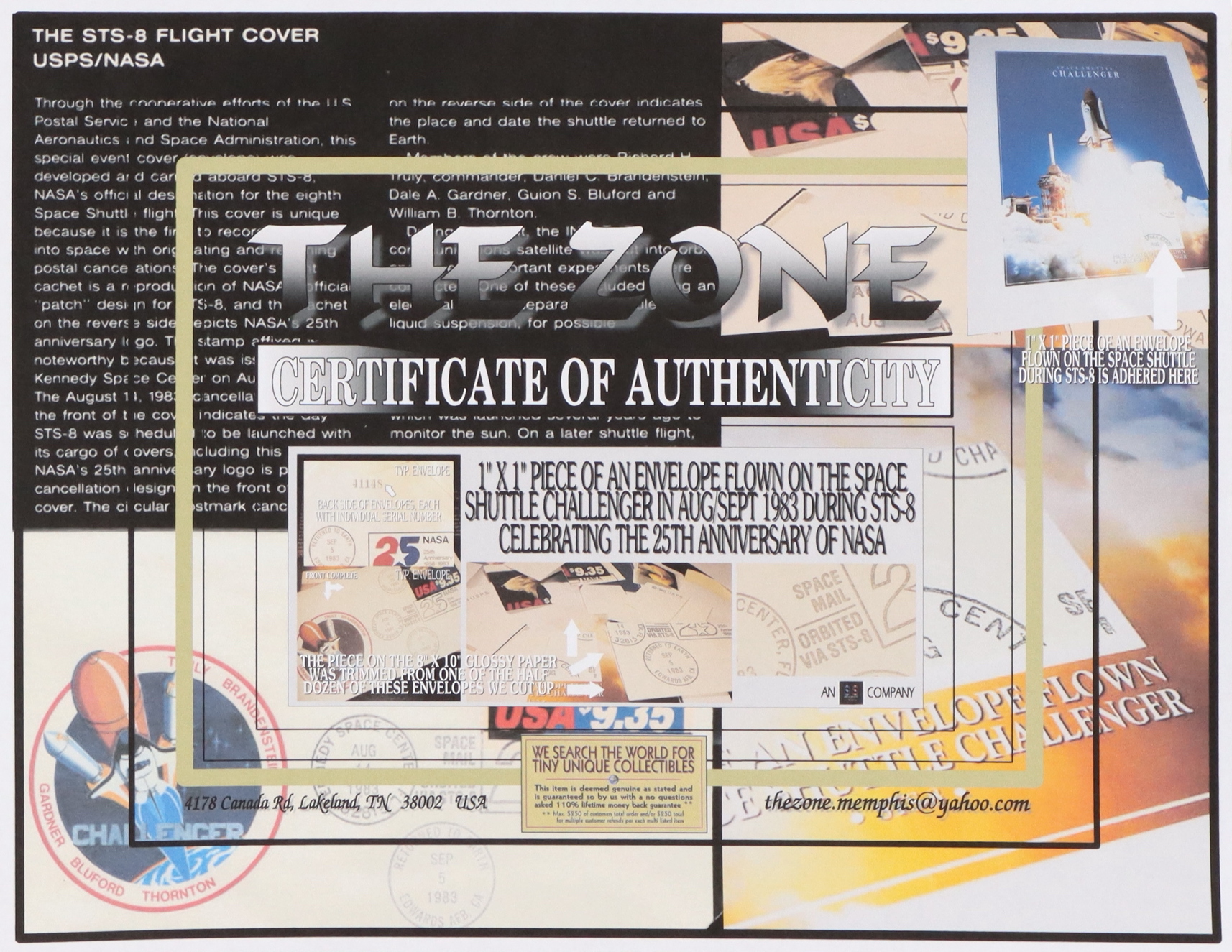 Photo measures approximately 6" x 8" in size. Featuring a piece of An Envelope Flown On The Space Shuttle Challenger in August/September 1983 During STS-8 Celebrating the 25th anniversary of NASA.