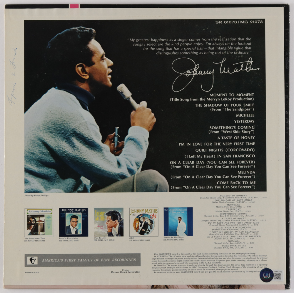 Vinyl record album has been hand-signed on the front cover by Johnny Mathis (HOF).