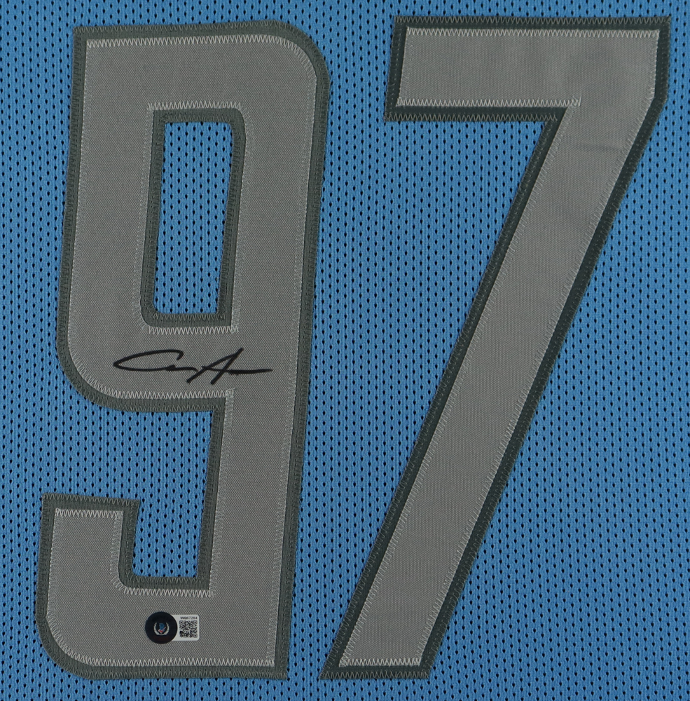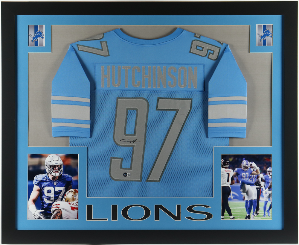 Custom frame measures approximately 35" x 43" in size and features a jersey hand-signed by Aidan Hutchinson.