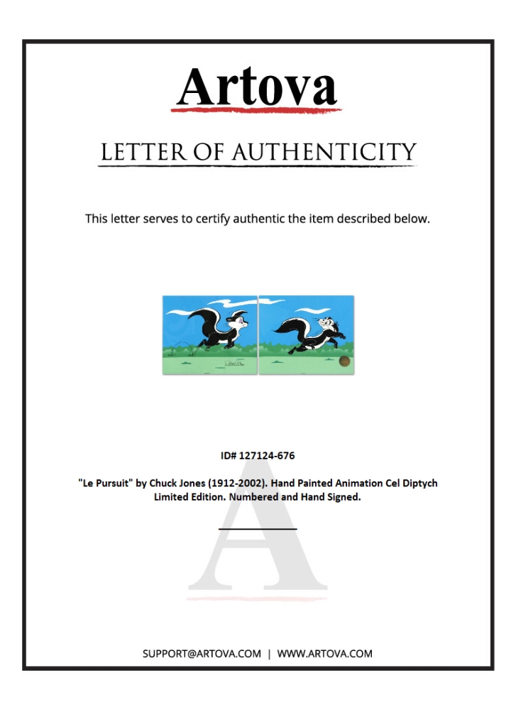 Own this amazing piece based on the original line image hand drawn and hand-inked on paper by Mr. Jones! "Le Pursuit" is a sold out limited edition 2 part animation cel with hand painted coloring on sericel outline, numbered and hand-signed by Chuck Jones (1912-2002)! Includes Certificate of Authenticity! Each cel measures approx. 10.5" x 12.5".