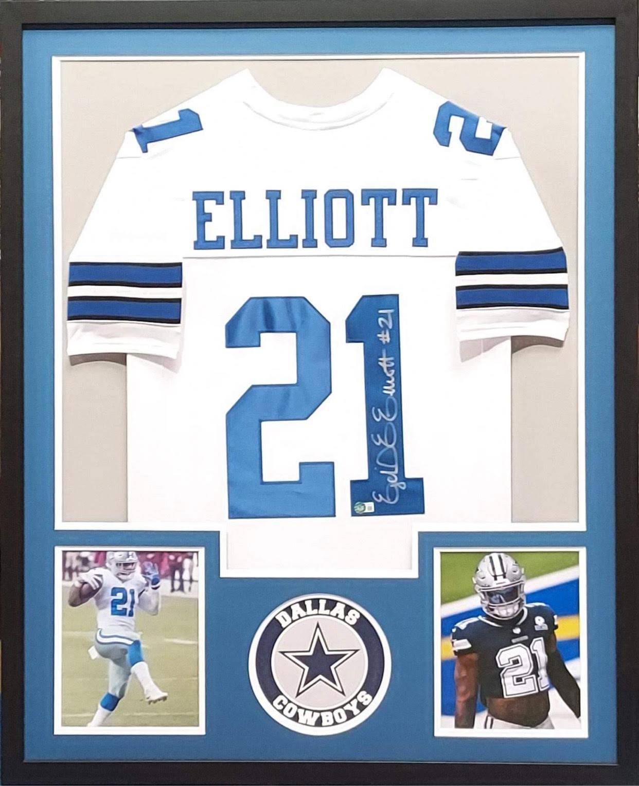 Custom frame measures 36" x 42" in size and features a jersey that has been hand-signed by Ezekiel Elliott.