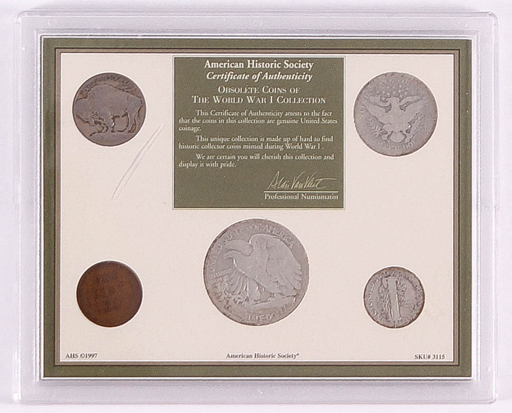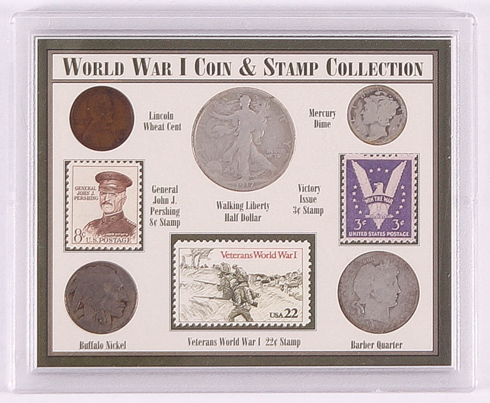 Set includes Lincoln Wheat Cent, Walking Liberty Half Dollar, Mercury Dime, Buffalo Nickel, Barber Quarter, General John J. Pershing 8 cent stamp, Veterans WWI 22 cent stamp and a Victory Issue 3 cent stamp.