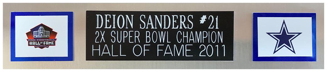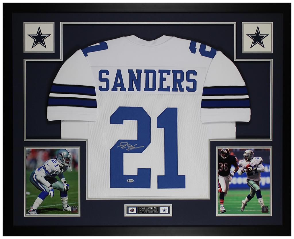 Custom framed display measures 35" x 43" in size and features a custom on-field style jersey that has been hand-signed by Deion Sanders (HOF).