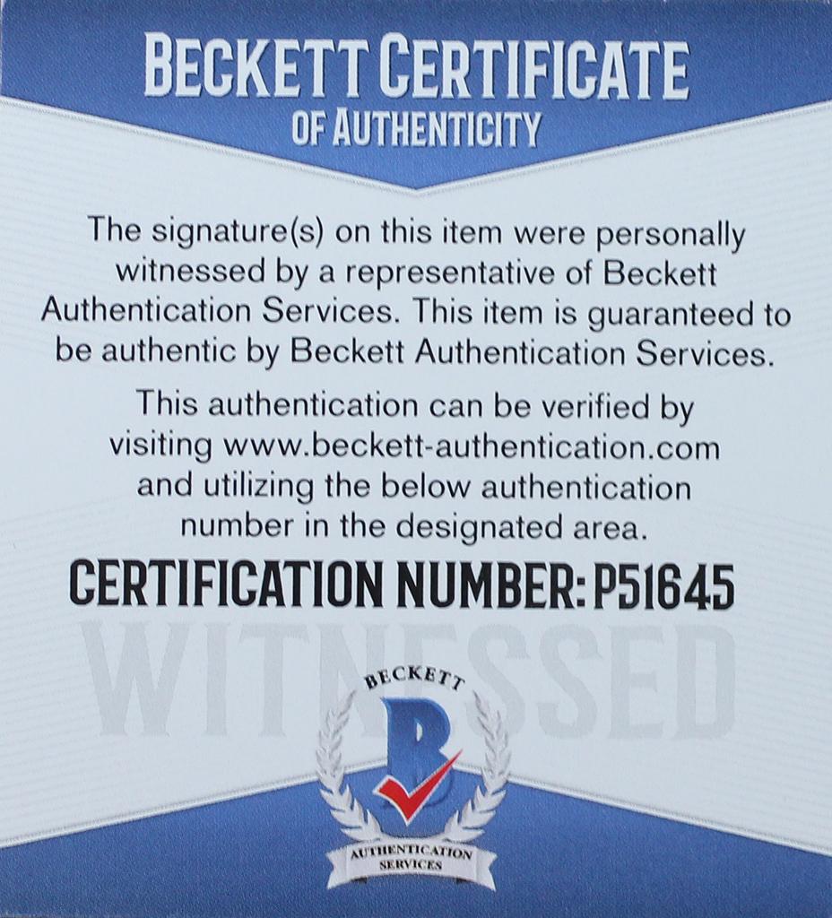 The lot / autograph(s) includes an official Beckett Authentication Services serially-numbered hologram and matching COA for authenticity purposes. The signing of this item was witnessed by Beckett.