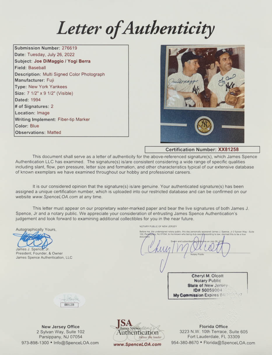 Custom framed display measures approximately 16.5" x 16.5" in size and has been hand-signed by Joe DiMaggio (D. 1999, New York Yankees, HOF) and Yogi Berra (D. 2015, New York Yankees, HOF).