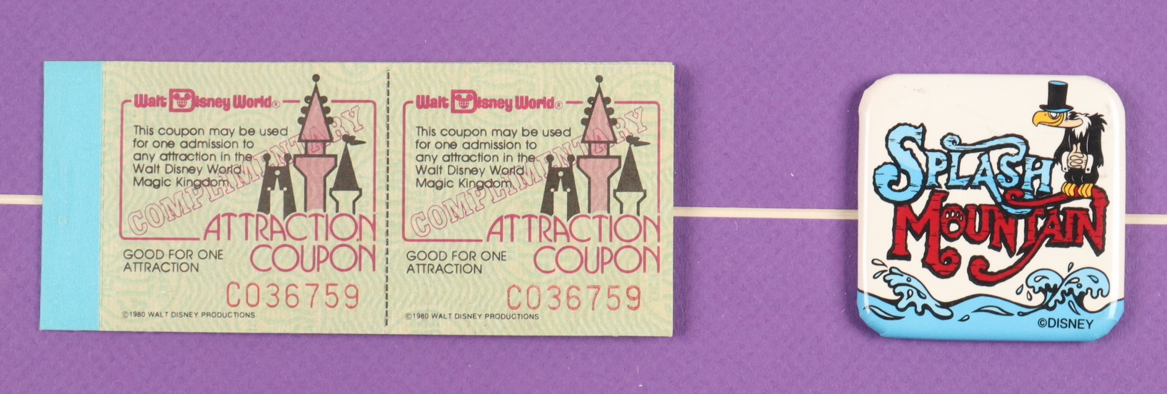 Walt Disney World Splash Mountain Custom Framed Poster with Vintage Disney World Ticket Book & Employee Ride Pin