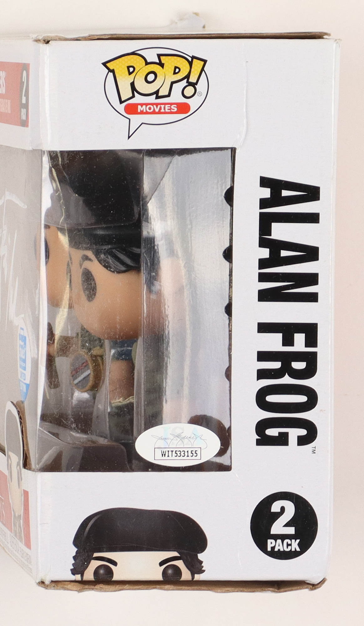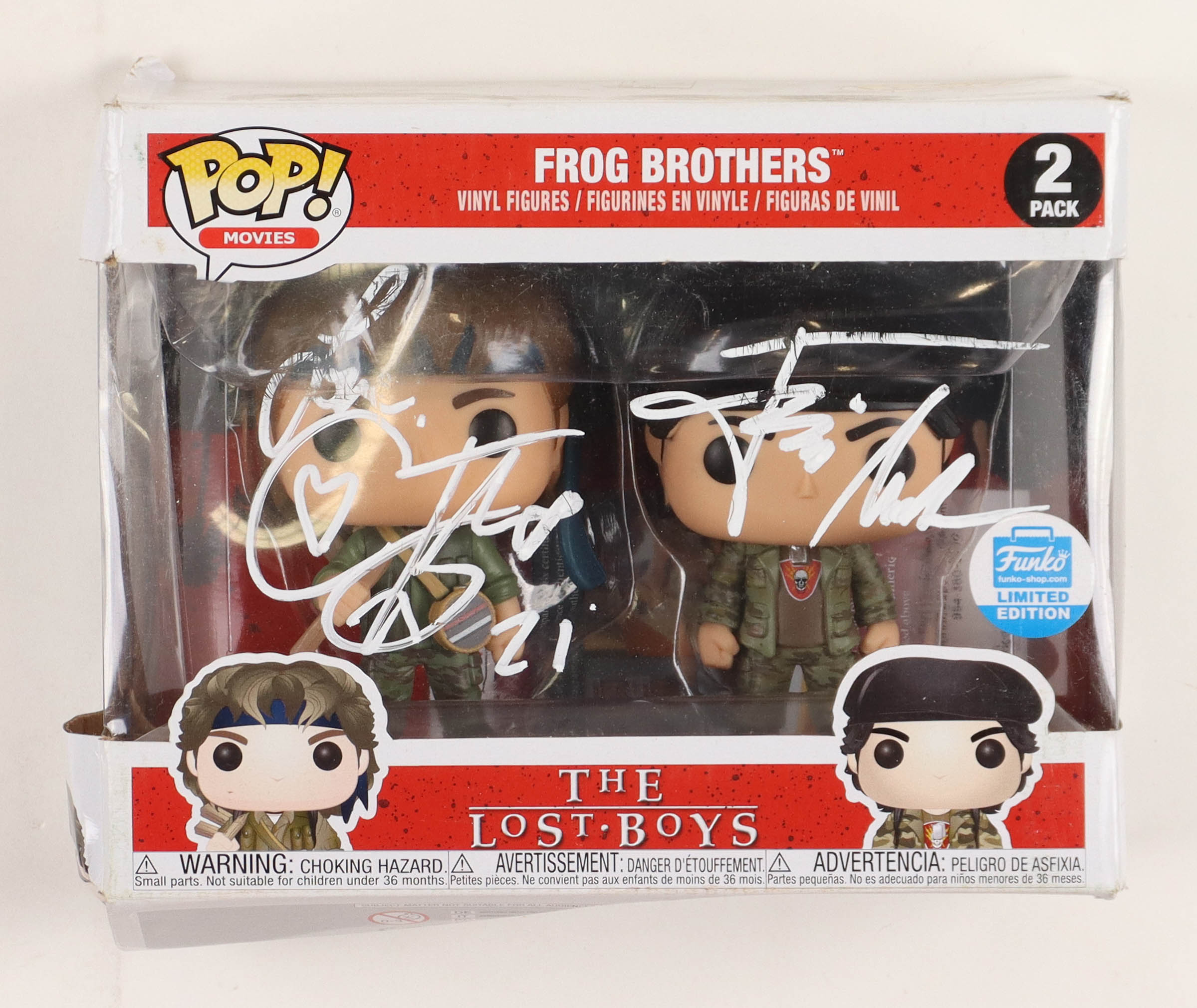 Funko Pop! figure measures approximately 4" tall and has been hand-signed by Corey Feldman (Edgar Frog) and Jamison Newlander (Alan Frog). Please note, the signatures are smeared and the box has minor damage.