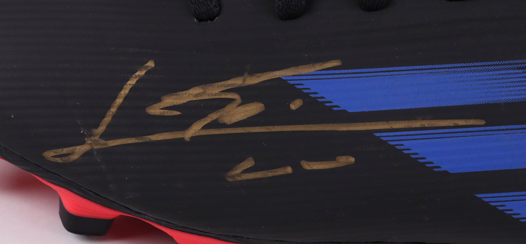 Adidas soccer cleat, left shoe, size 8.5. Hand-signed by Lionel Messi (Barcelona FC).