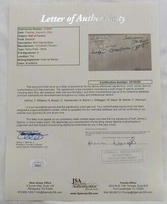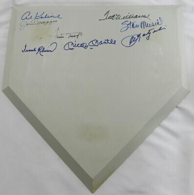 Full-size home plate base measures approximately 17" x17" in size and has been hand-signed by (8) baseball Hall of Famers, with Al Kaline (D. 2020, Detroit Tigers, HOF), Joe DiMaggio (D. 1999, New York Yankees, HOF), Willie Mays (San Francisco Giants, HOF), Frank Robinson (D. 2019, Cincinnati Reds, HOF), Mickey Mantle (D. 1995, New York Yankees, HOF), Ted Williams (D. 2002, Boston Red Sox, HOF), Stan Musial (D. 2013, St. Louis Cardinals, HOF), and Carl Yastrzemski (Boston Red Sox, HOF).