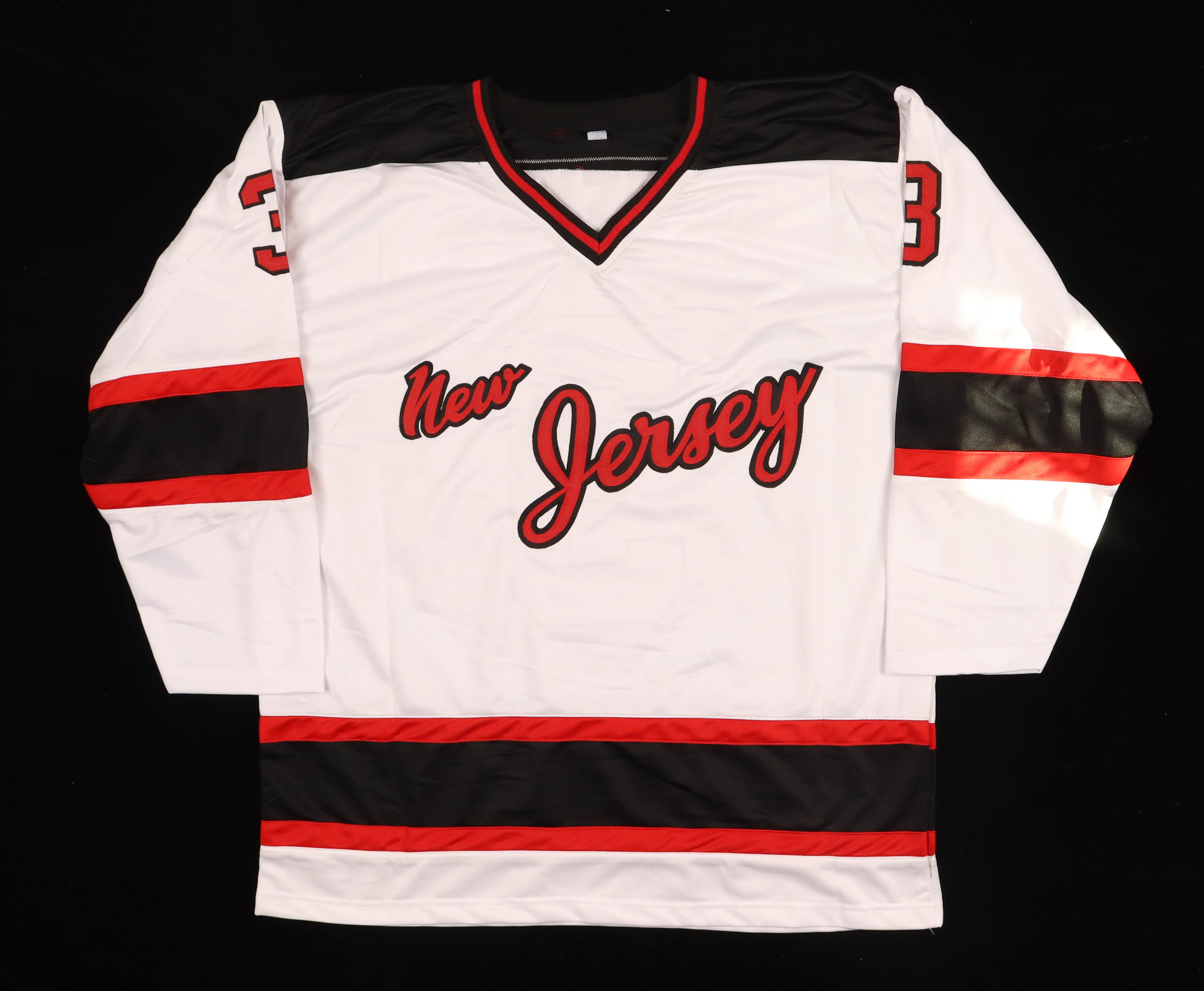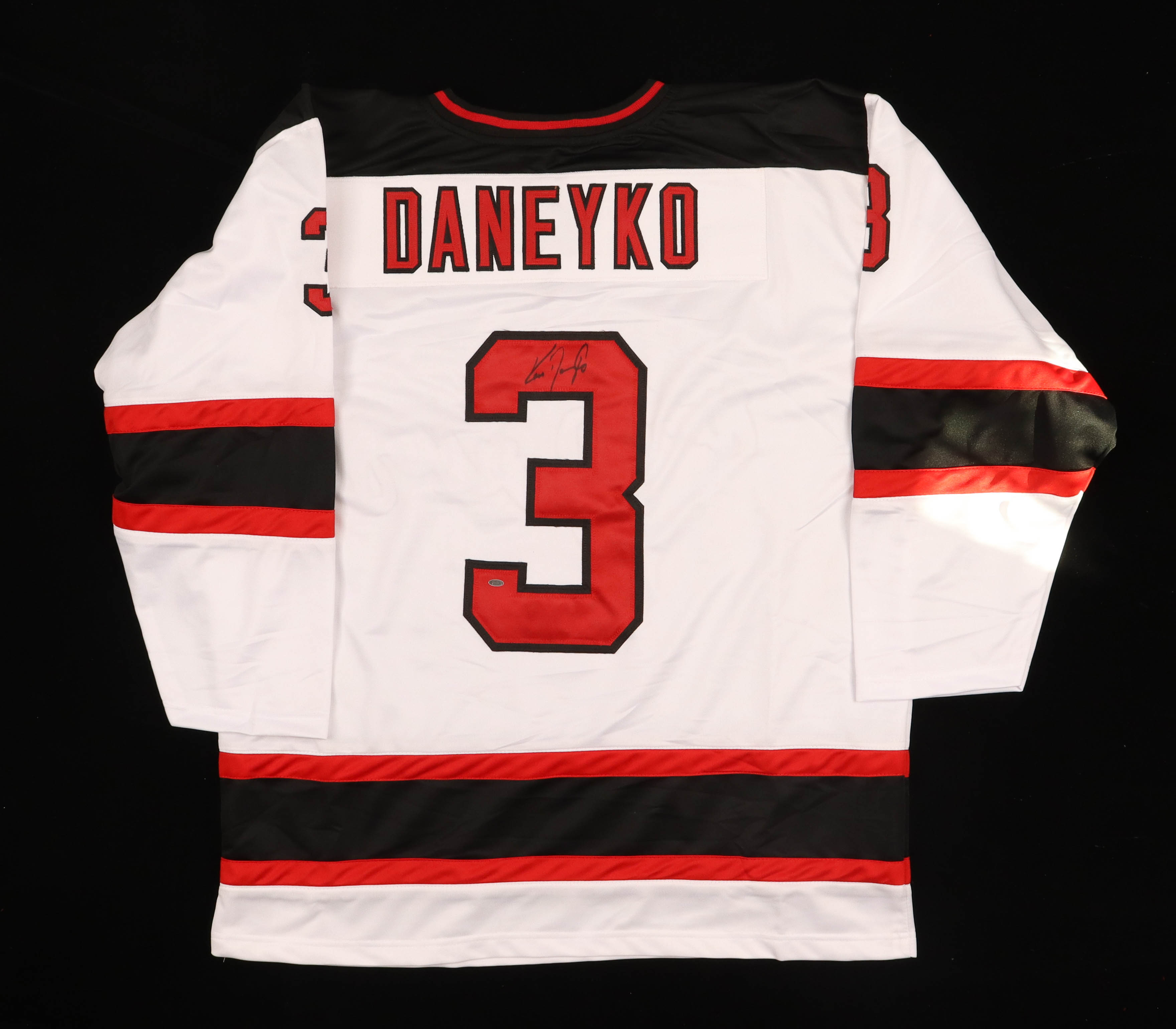 Custom on-ice style jersey. Everything is sewn on, size XL. Has been hand-signed by Ken Daneyko.
