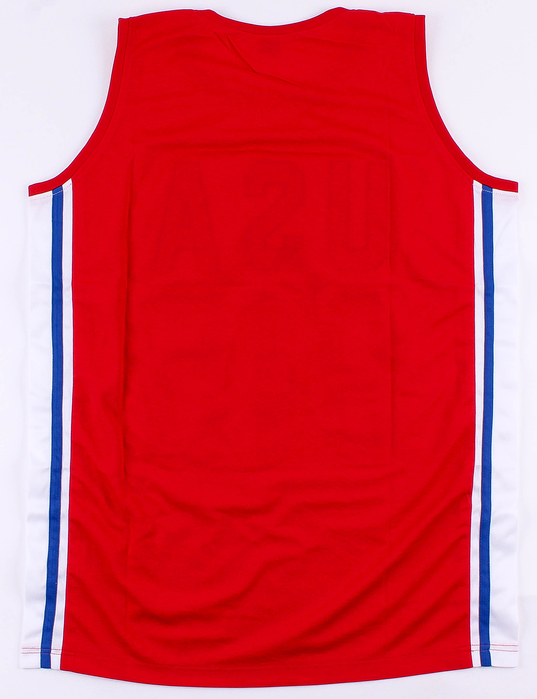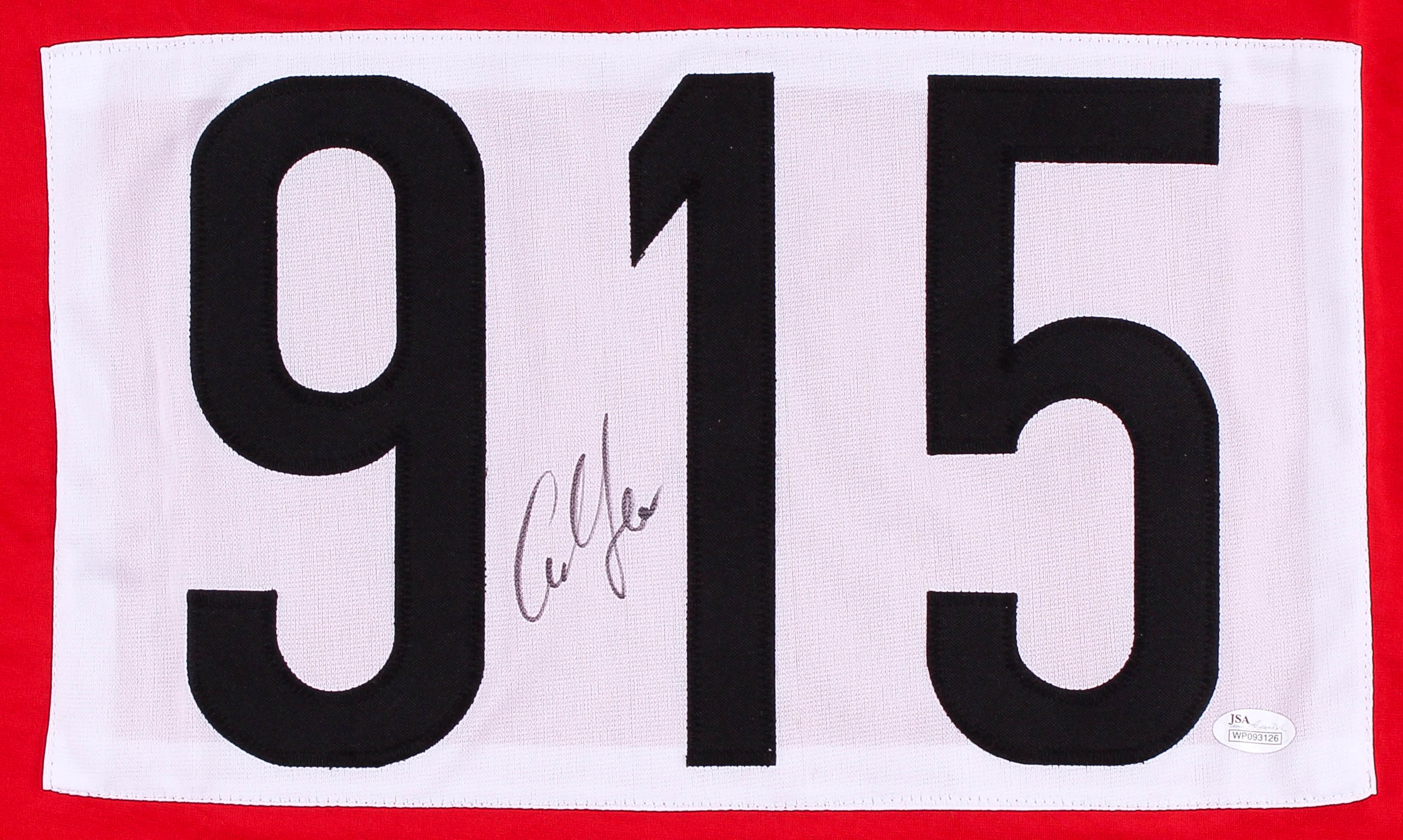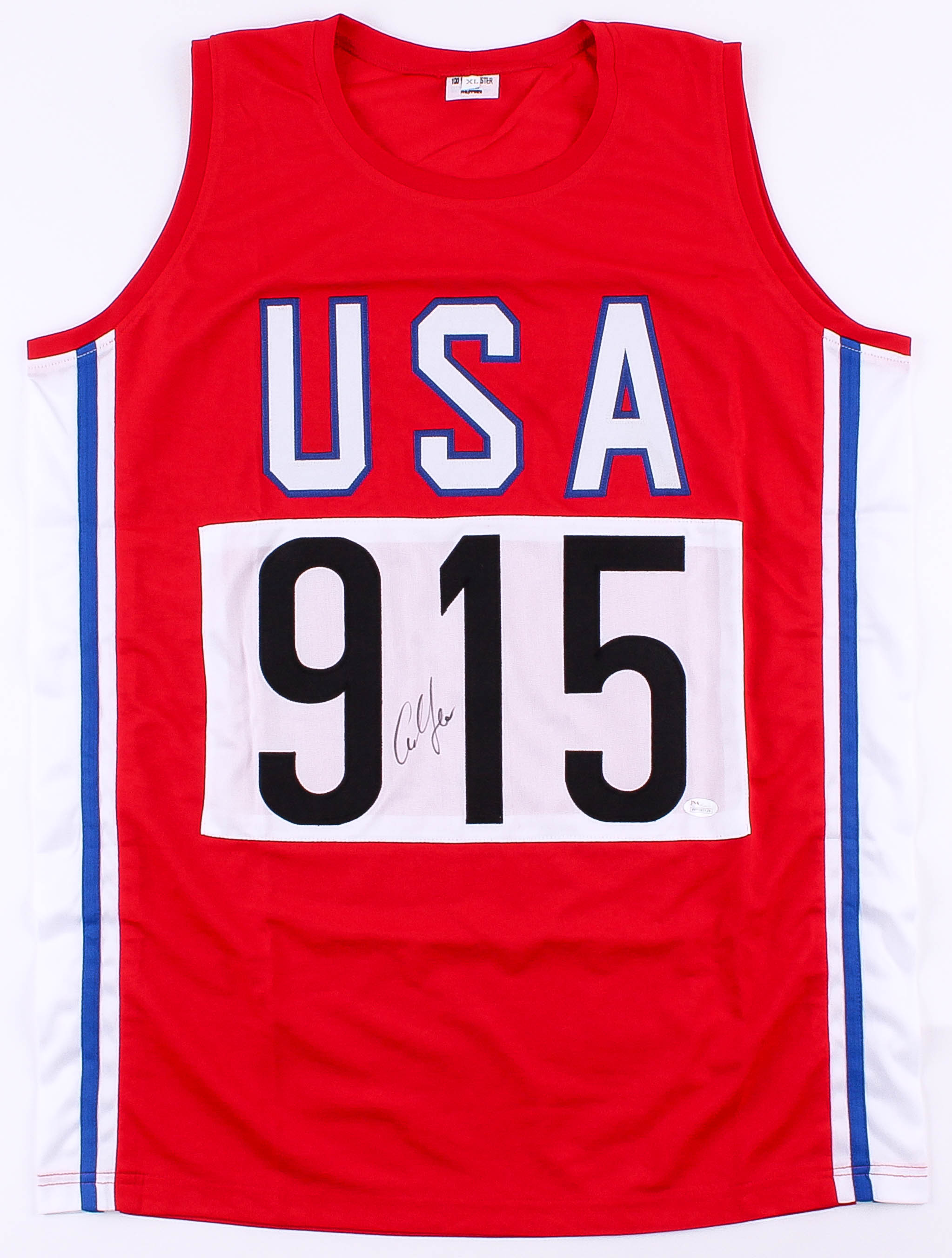 Custom on-track style jersey. Everything is sewn on, size XL. Hand-signed by Carl Lewis.