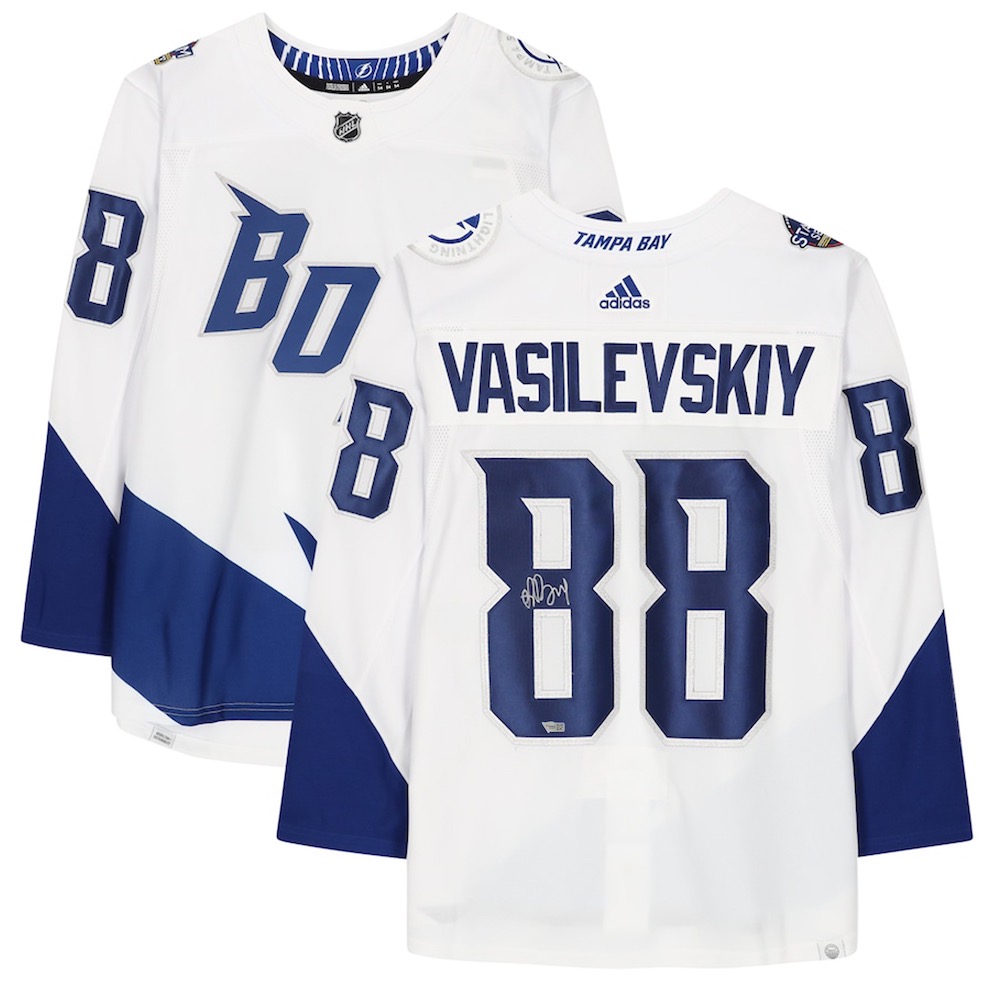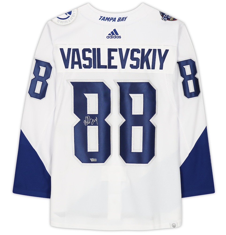 Adidas on-ice style jersey. Everything sewn on, size XL. Hand-signed by Andrei Vasilevskiy (Tampa Bay Lightning).