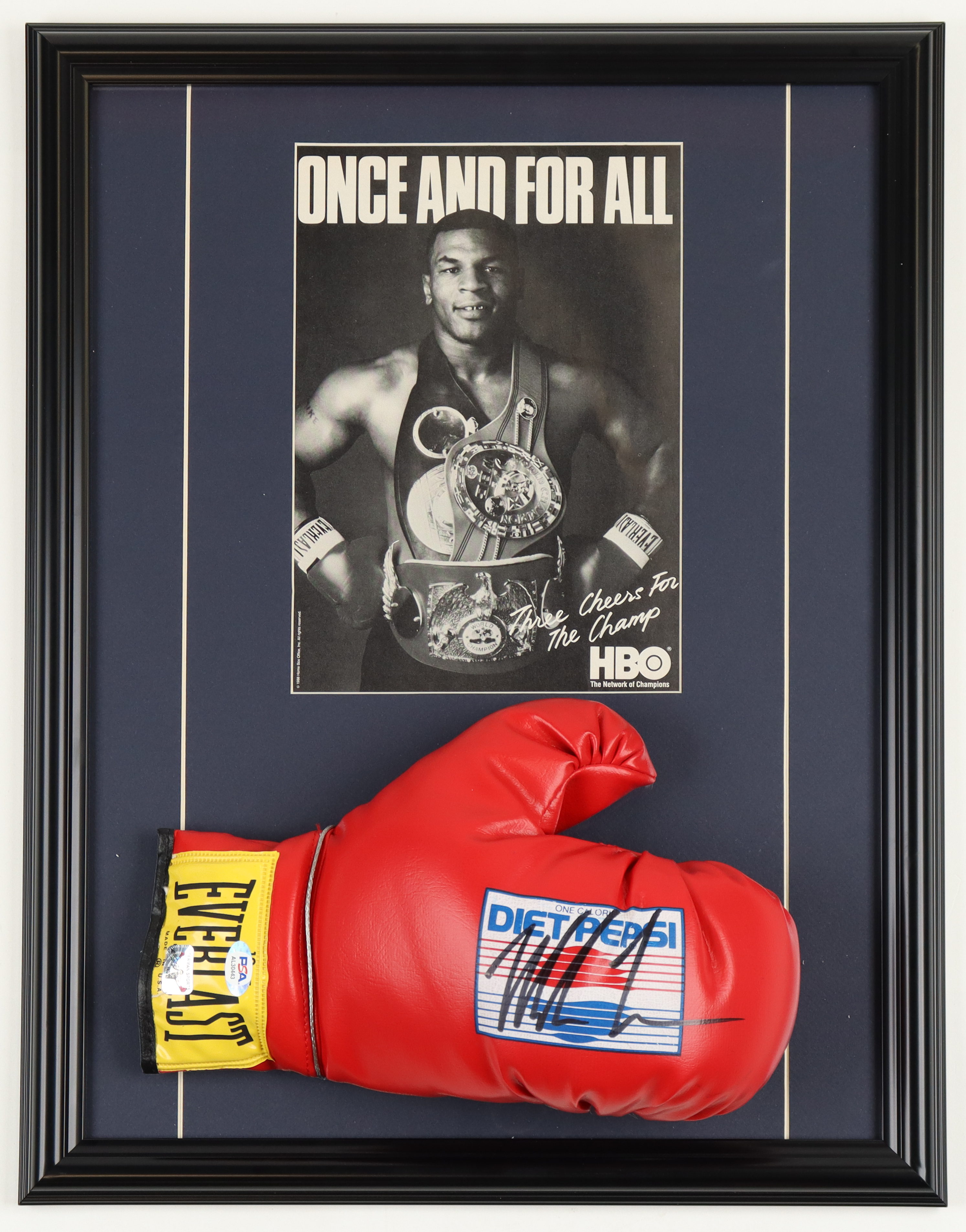 Mike Tyson Signed Custom Framed Diet Pepsi Fight Sponsor Promo Glove with HBO Original Fight Ad (PSA & Tyson)
