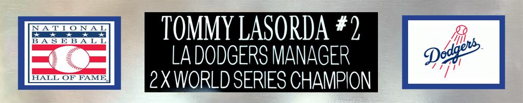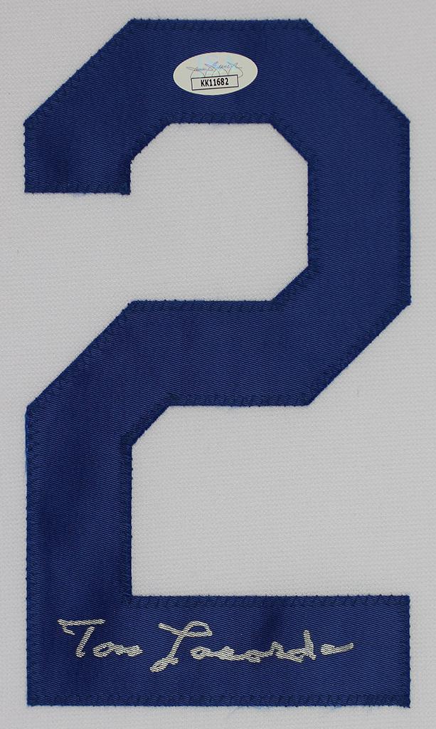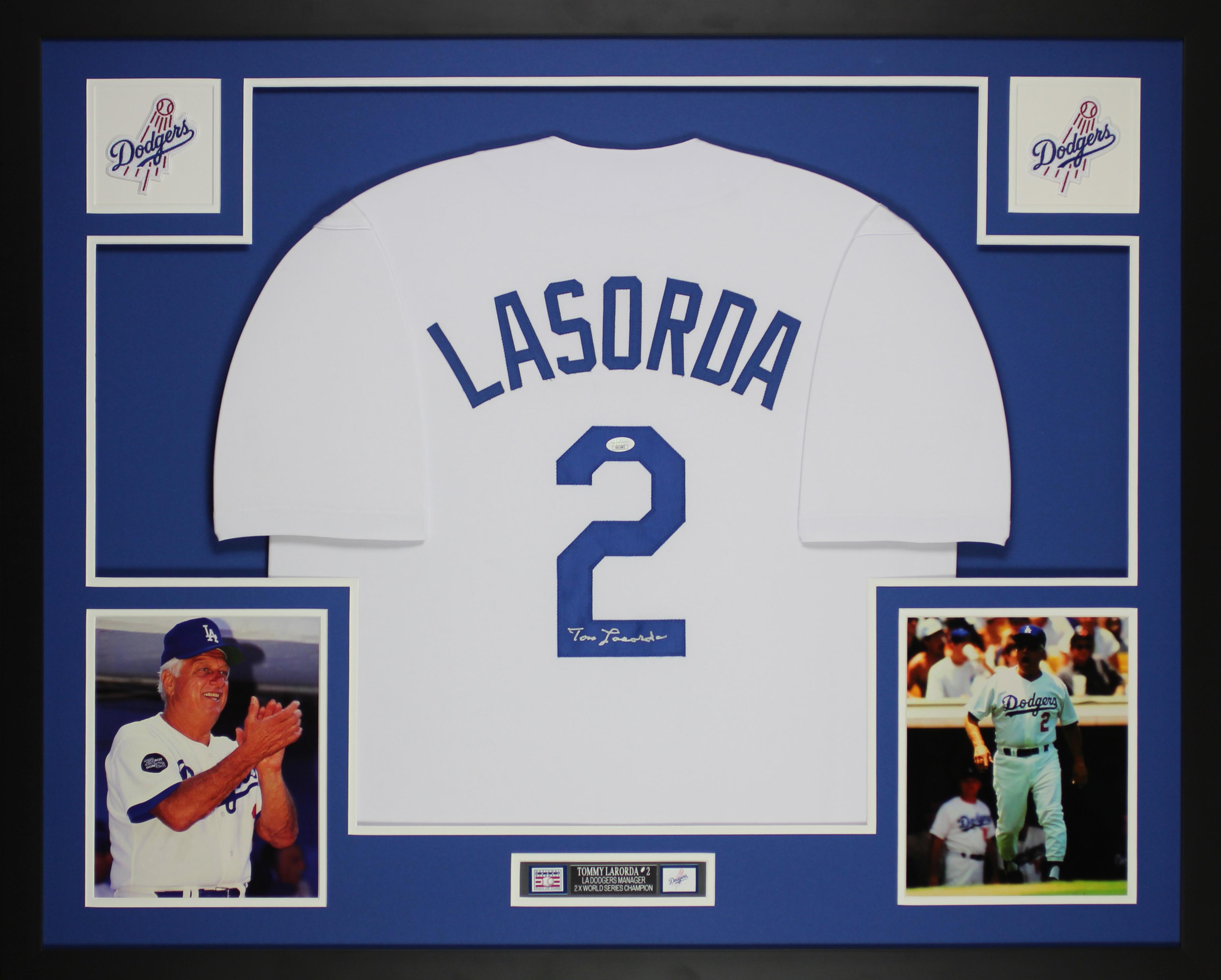 Custom frame measures 35" x 43" in size and features a jersey hand-signed by Tommy Lasorda (D. 2021, HOF).