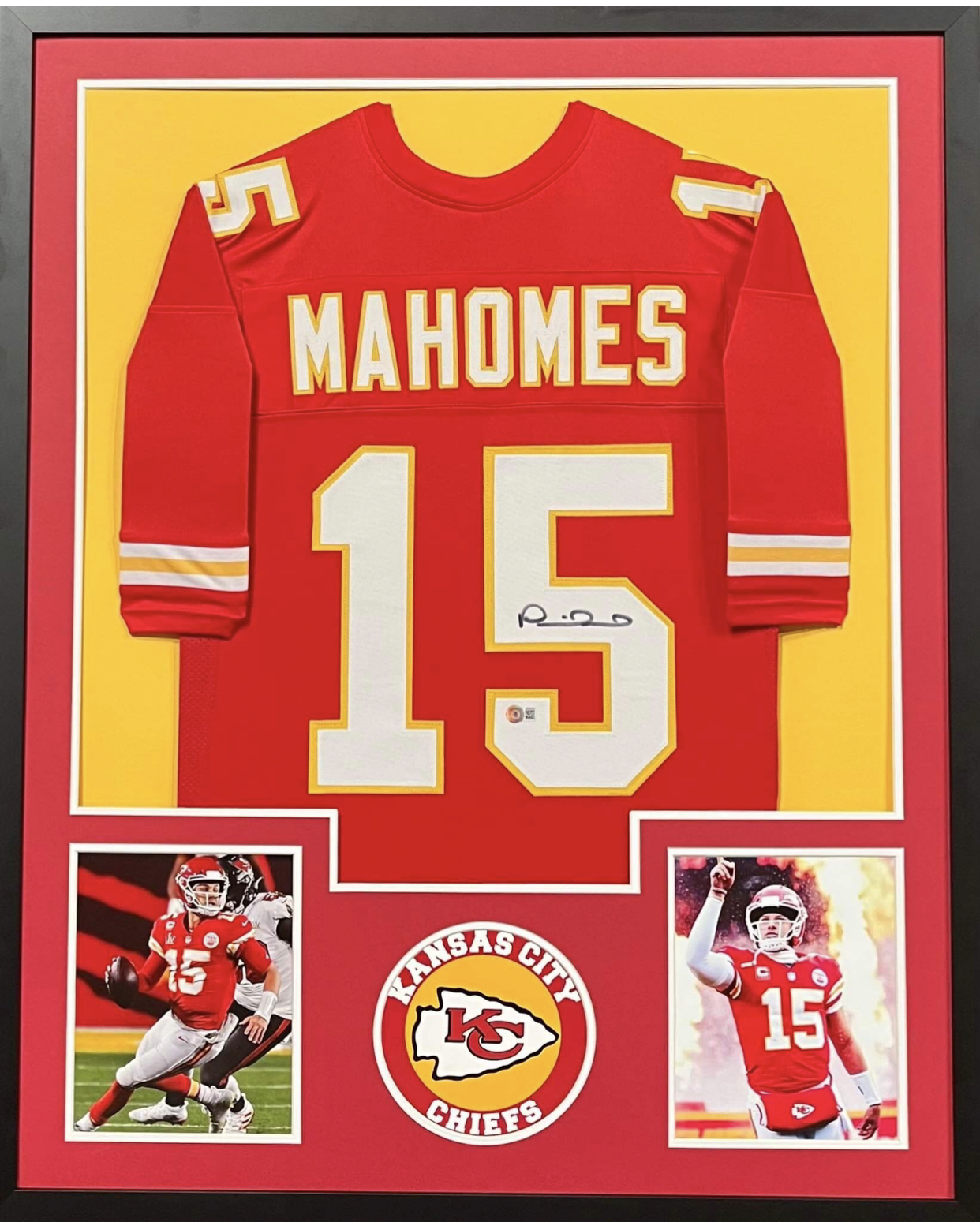 Custom frame measures approximately 36" x 42" in size and features a jersey hand-signed by Patrick Mahomes.