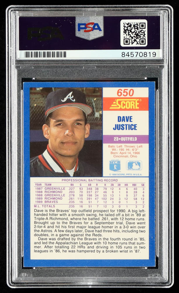 Dave Justice Signed 1990 Score #650 RC (PSA)