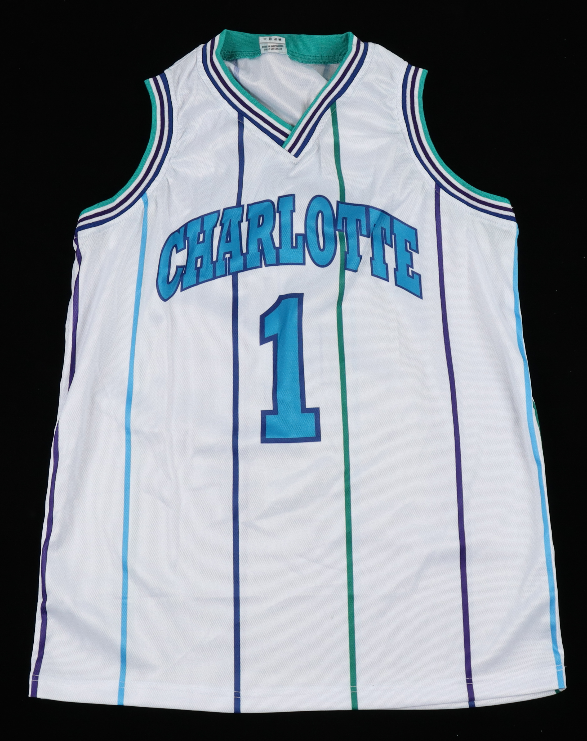 Custom on-court style jersey. Everything is sewn on, size XL. Hand-signed by Muggsy Bogues.