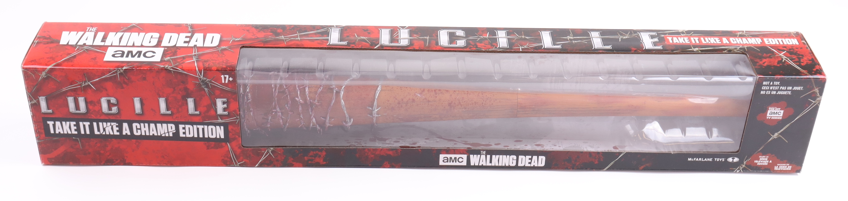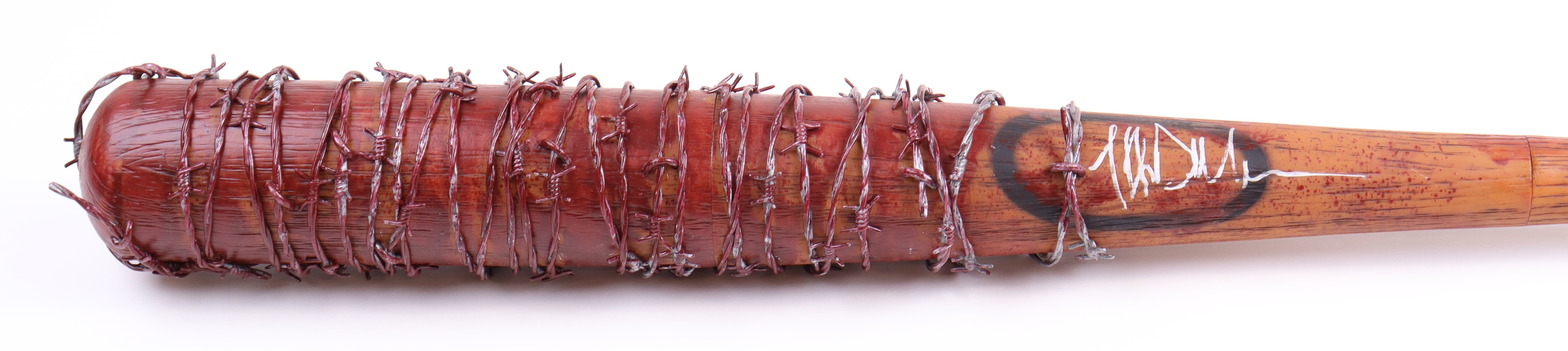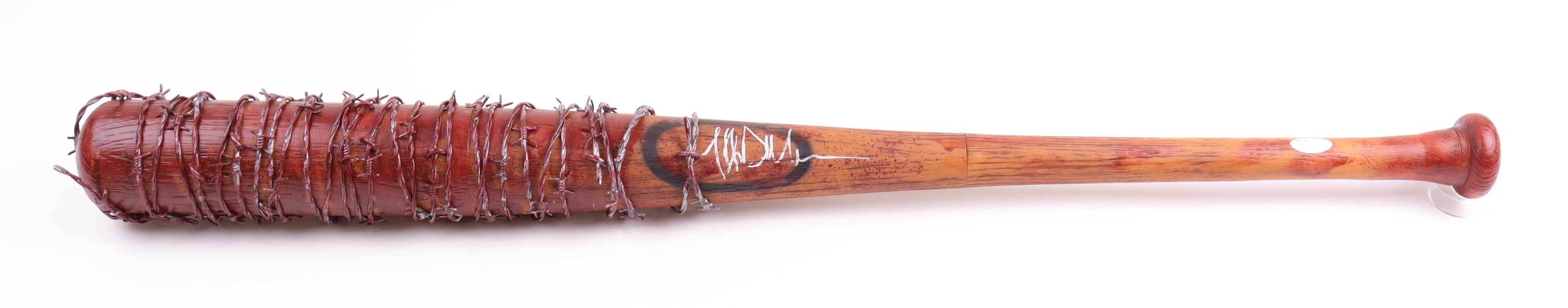 McFarlane Toys barbed wire baseball bat replica prop measures 32" in length and has been hand-signed by Jeffrey Dean Morgan (Negan).