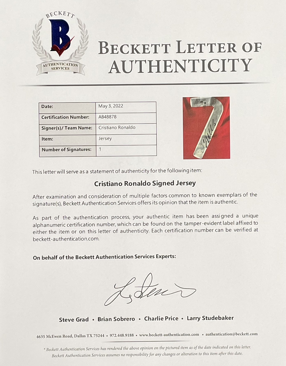 Nike on-field style jersey. Everything is sewn and printed on, size XL. Hand-signed by Cristiano Ronaldo.