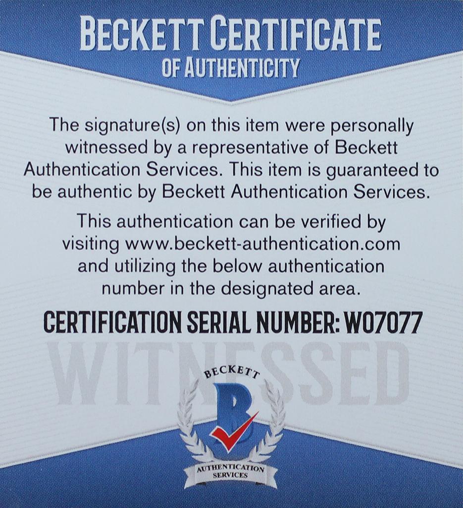 The lot / autograph(s) includes an official Beckett Authentication Services serially-numbered hologram and matching COA for authenticity purposes. The signing of this item was witnessed by Beckett.