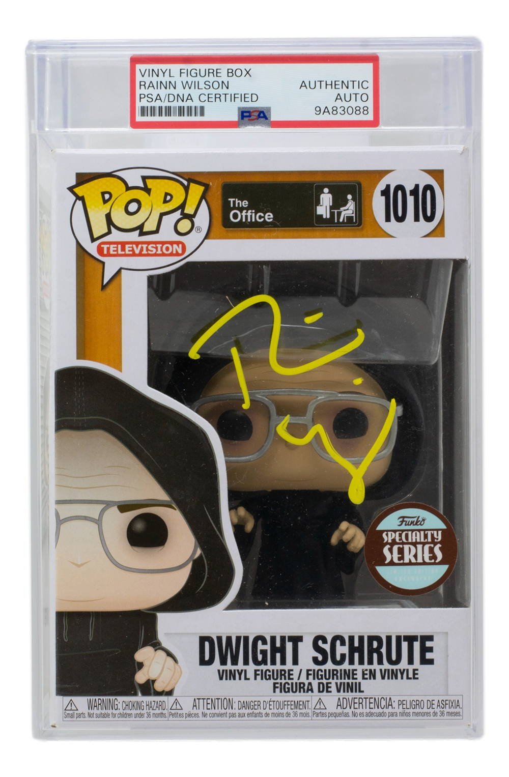 Encapsulated vinyl figure measures approximately 4" in height. Hand-signed by Rainn Wilson.