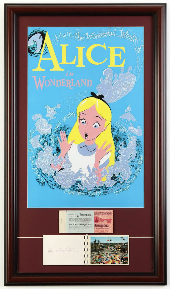 Disneyland's "Alice in Wonderland" Print Display with Vintage Ticket Book & On Site Souvenir Booklet