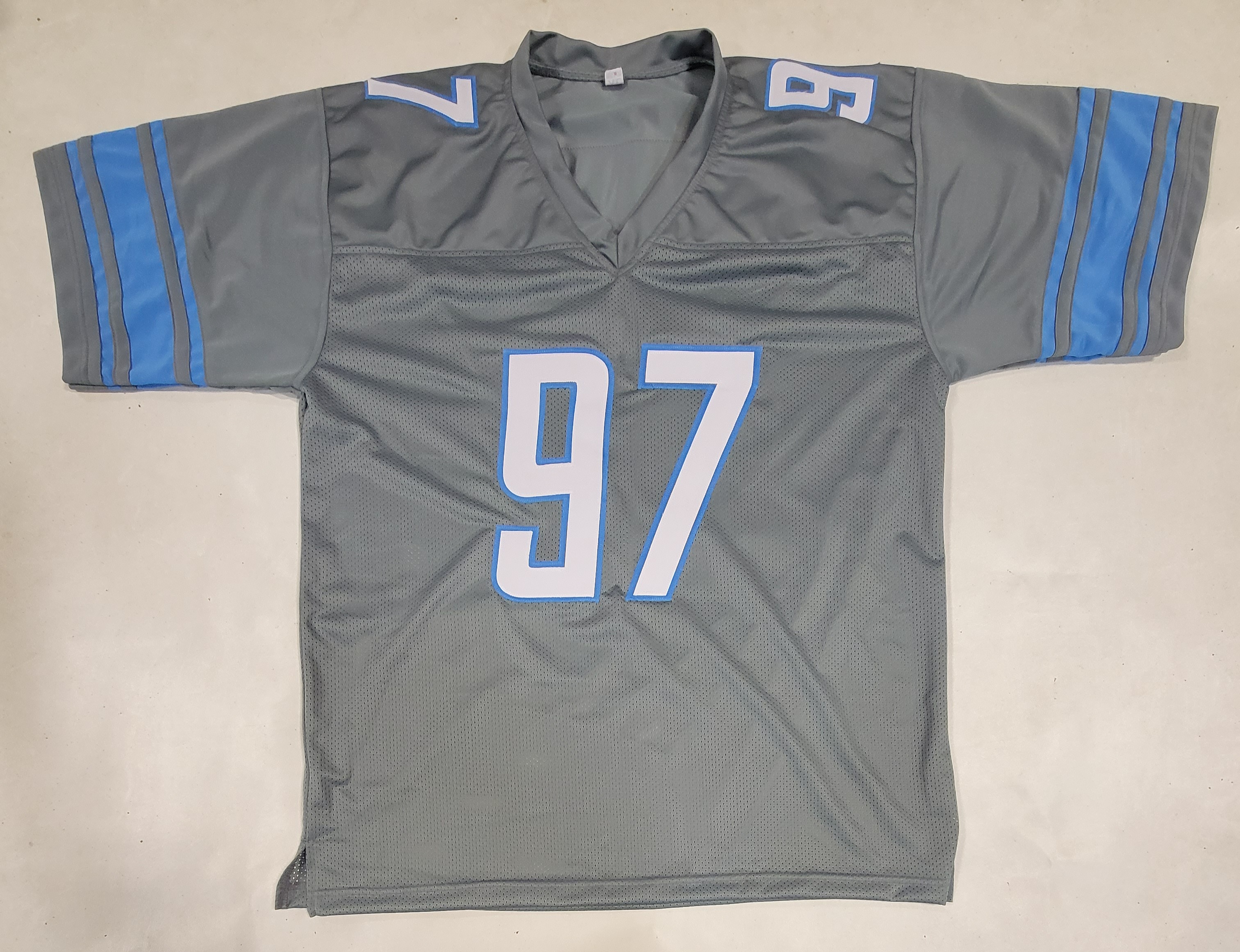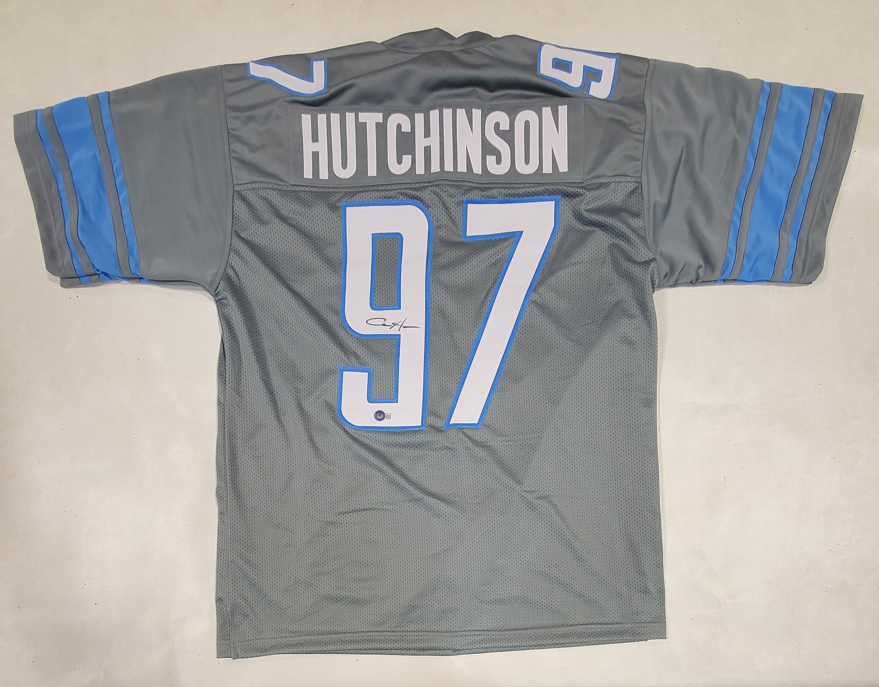 Custom on-field style jersey. Everything is sewn on, size XL. Hand-signed by Aidan Hutchinson.