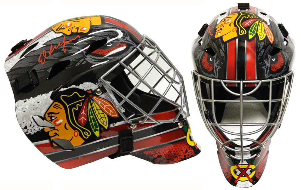 Franklin Chicago Blackhawks replica hockey goalie mask. Hand-signed by Ed Belfour (HOF).
