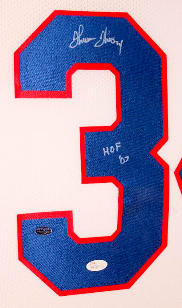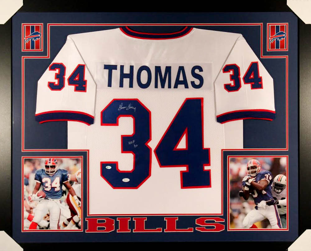 Custom frame measures approximately 35" x 43" in size and features a jersey which has been hand-signed in silver paint pen by Thurman Thomas (HOF).