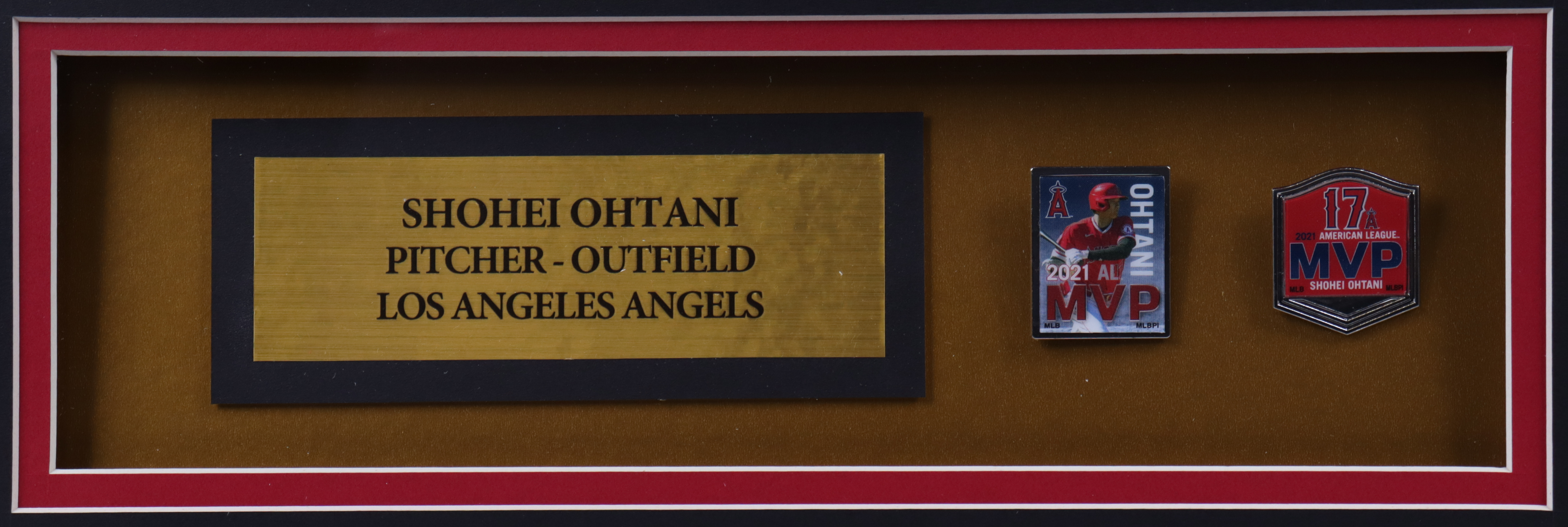 Custom frame measures approximately 32" x 36" in size and features an unsigned Shohei Ohtani jersey (Los Angeles Angels), as well as a set of (2) official 2021 Ohtani MVP pins.