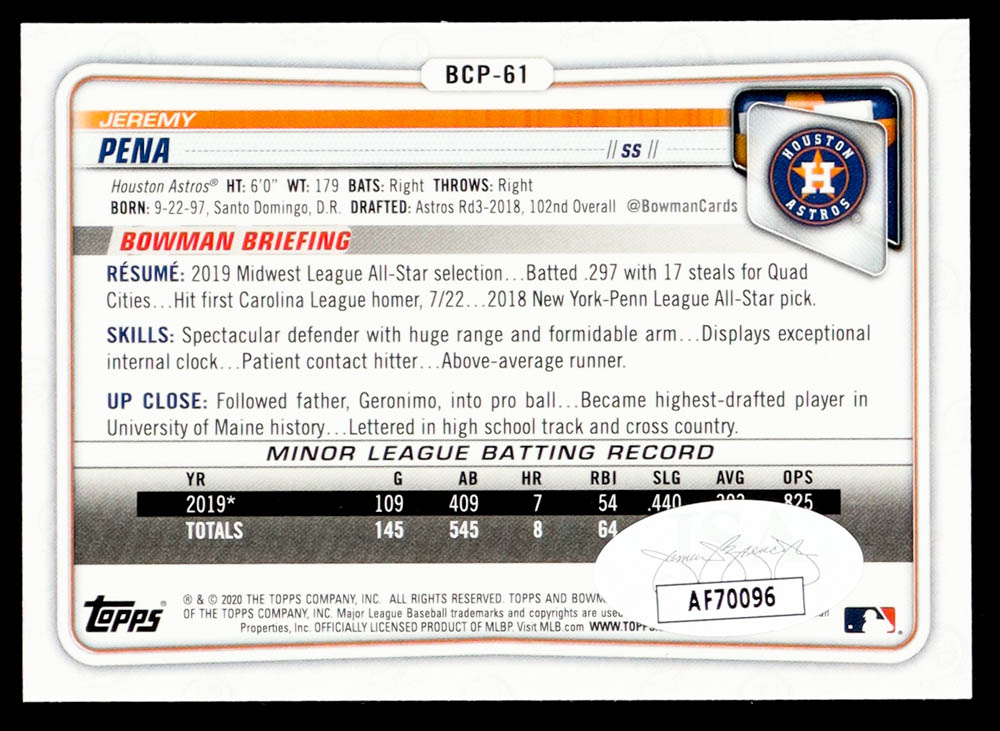 Jeremy Pena Signed 2020 Bowman Chrome Prospects #BCP61 RC (JSA)