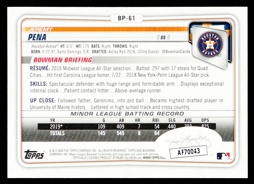 Jeremy Pena Signed 2020 Bowman Prospects #BP61 RC (JSA)