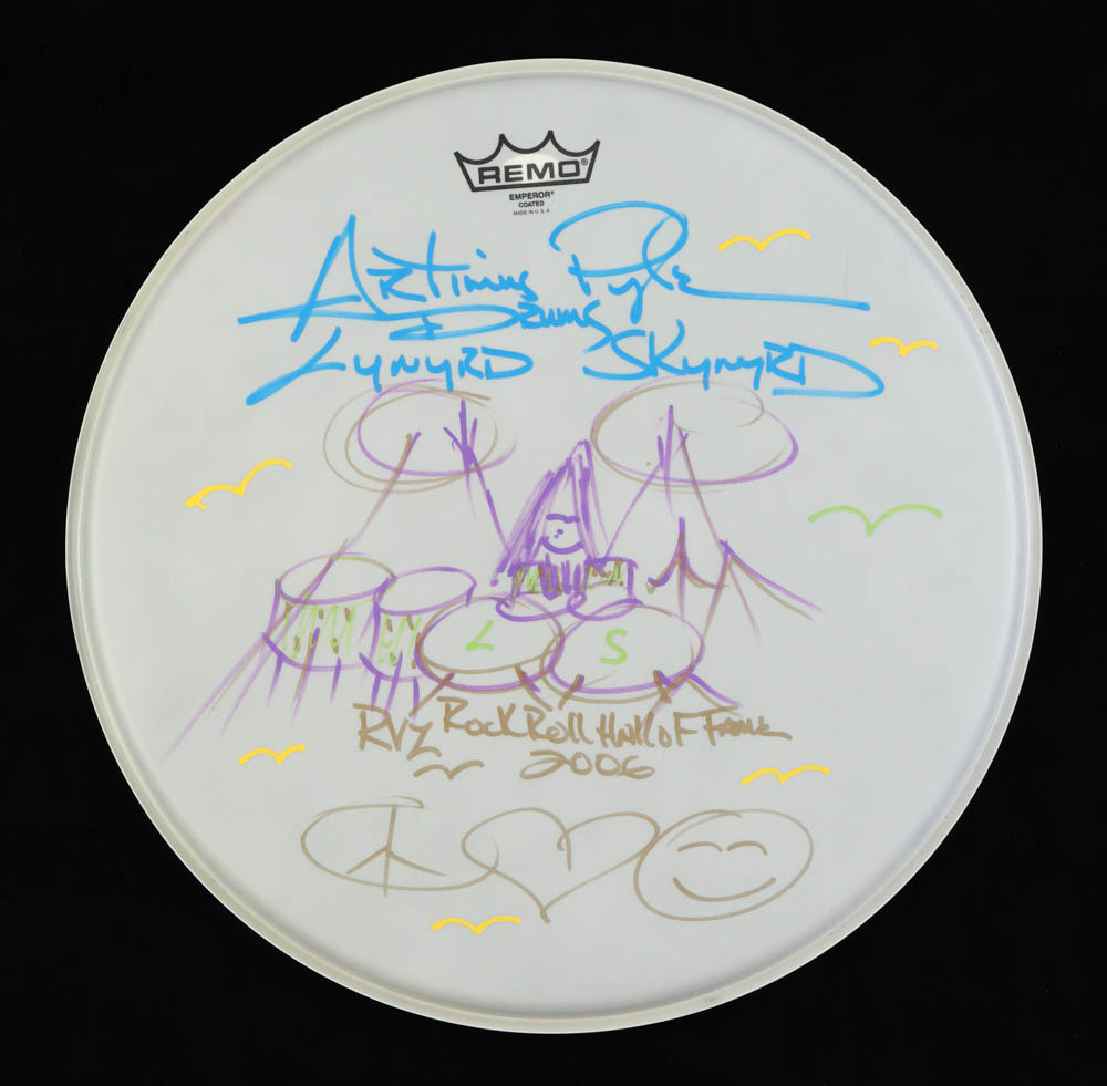 Artimus Pyle Signed 16.5" Drum Head Inscribed "Drums", "Lynyrd Skynyrd", "RVZ", "L.S." & "Rock Roll Hall of Fame 2006" with Hand Drawn Sketch (AutographCOA)