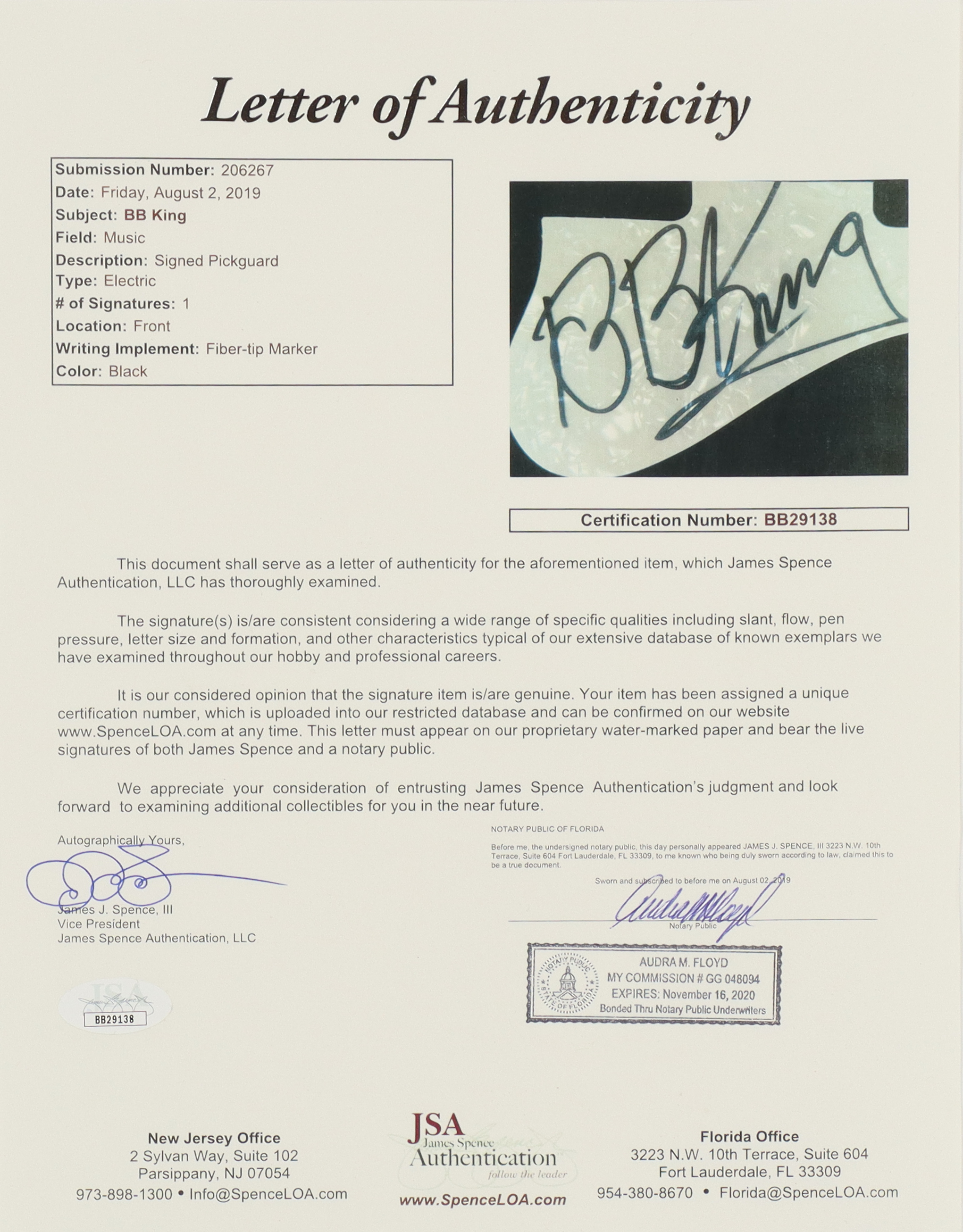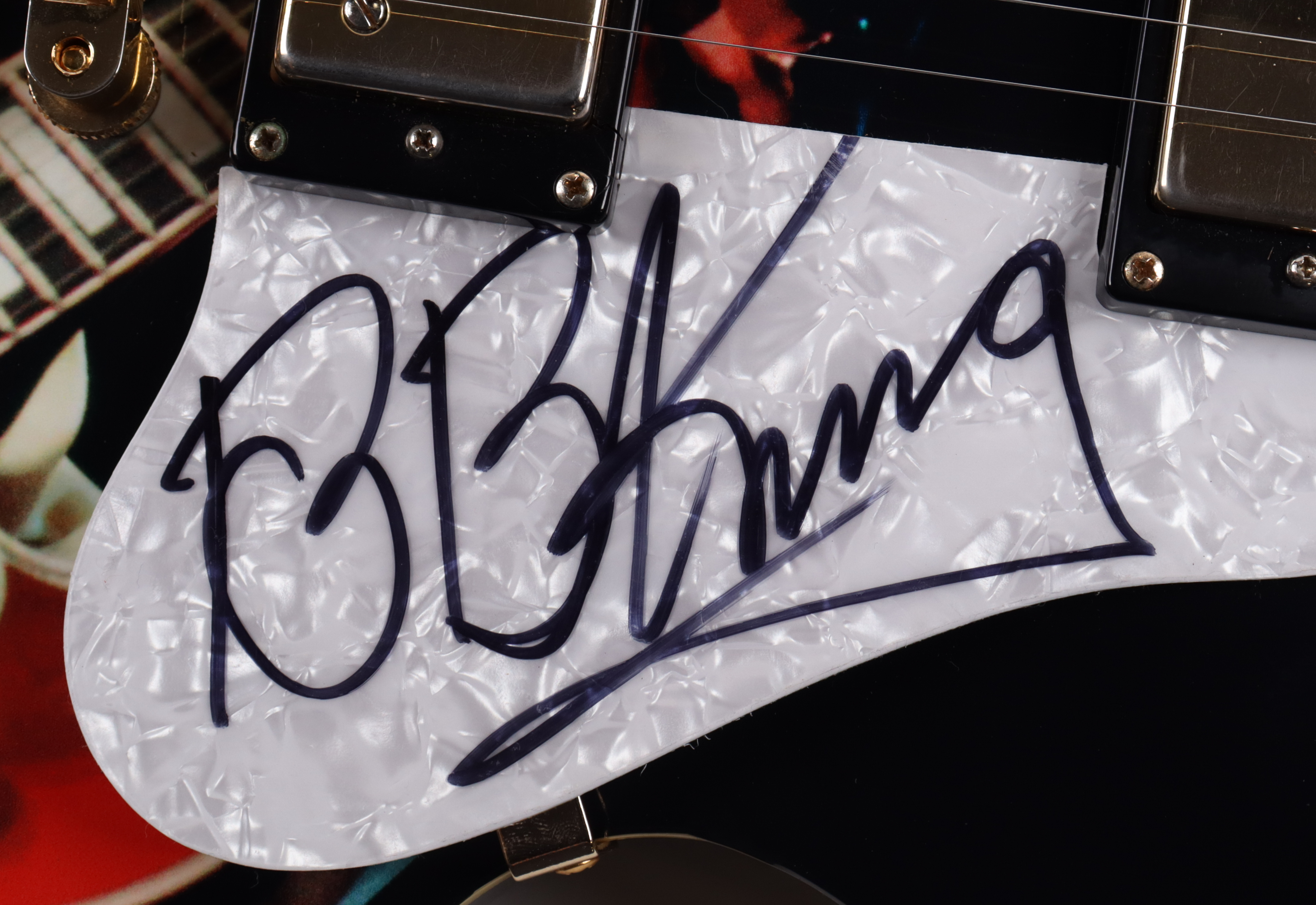 Custom electric guitar measures approximately 39" in length and has been hand-signed on the pickguard by B.B. King (D. 2015, HOF).