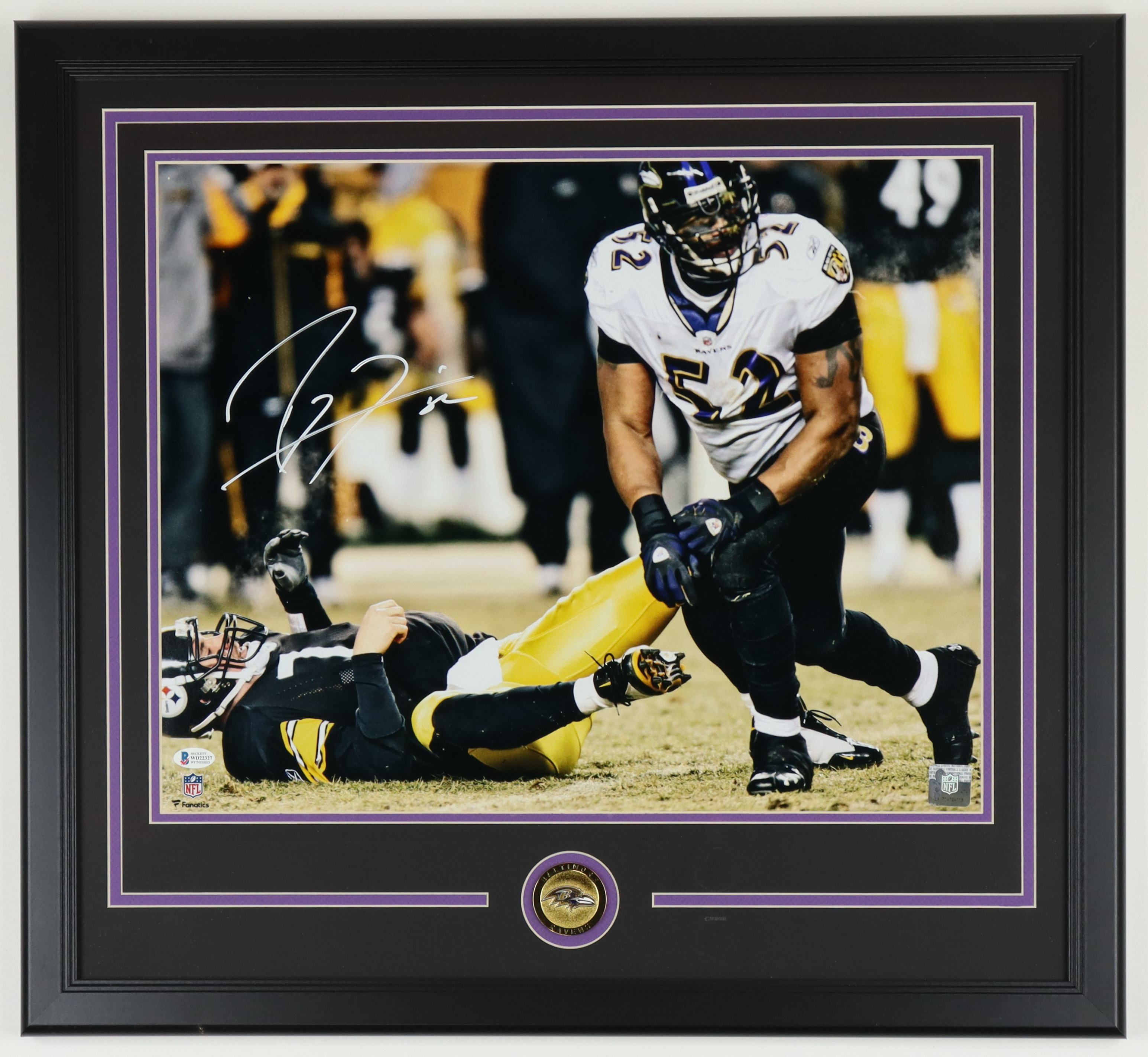 Custom frame measures approximately 25" x 27" in size and features a photo that has been hand-signed by Ray Lewis (Baltimore Ravens, HOF).