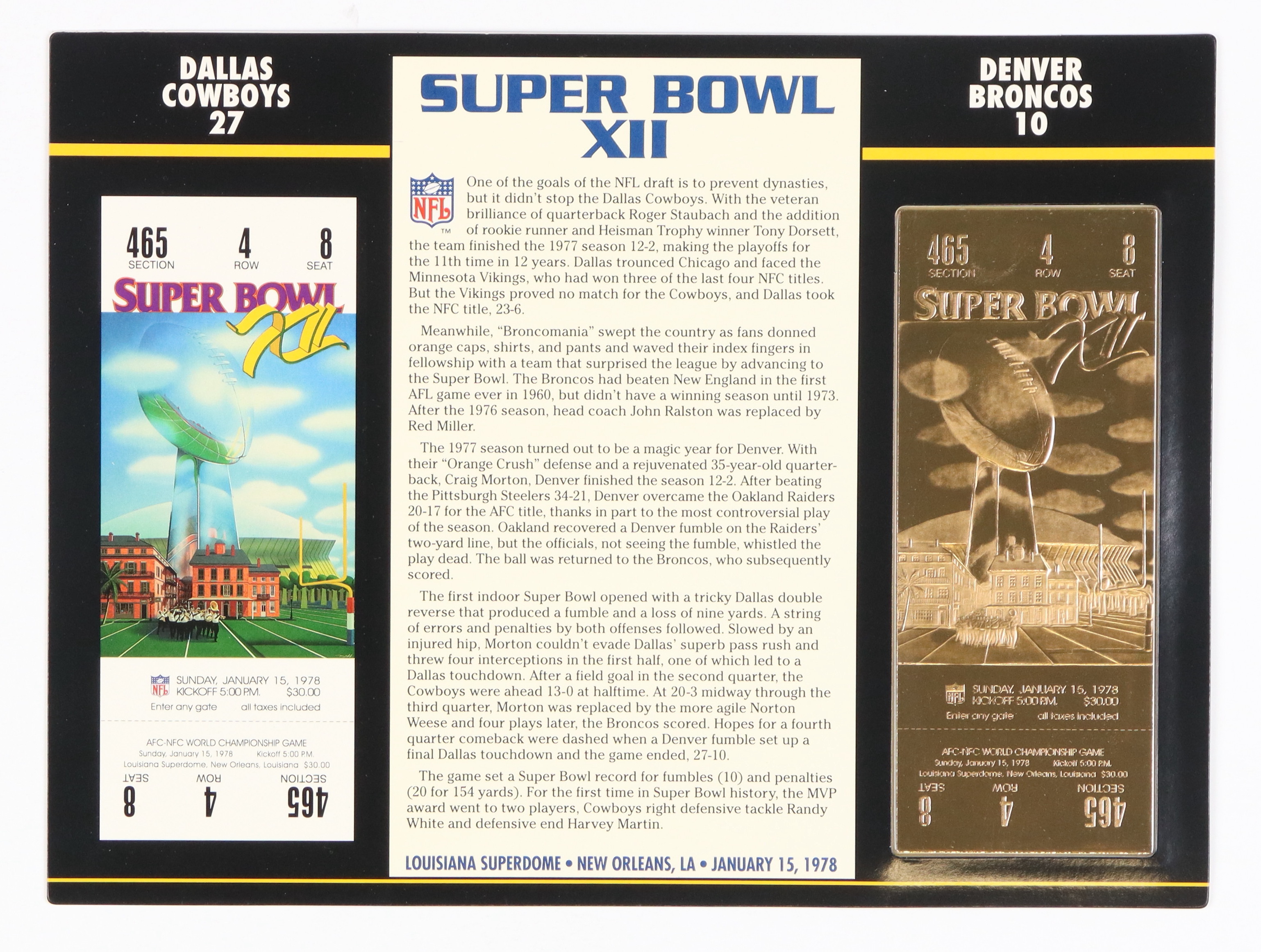 Display measures 9" x 12" in size and features a Super Bowl XII 23kt gold ticket.