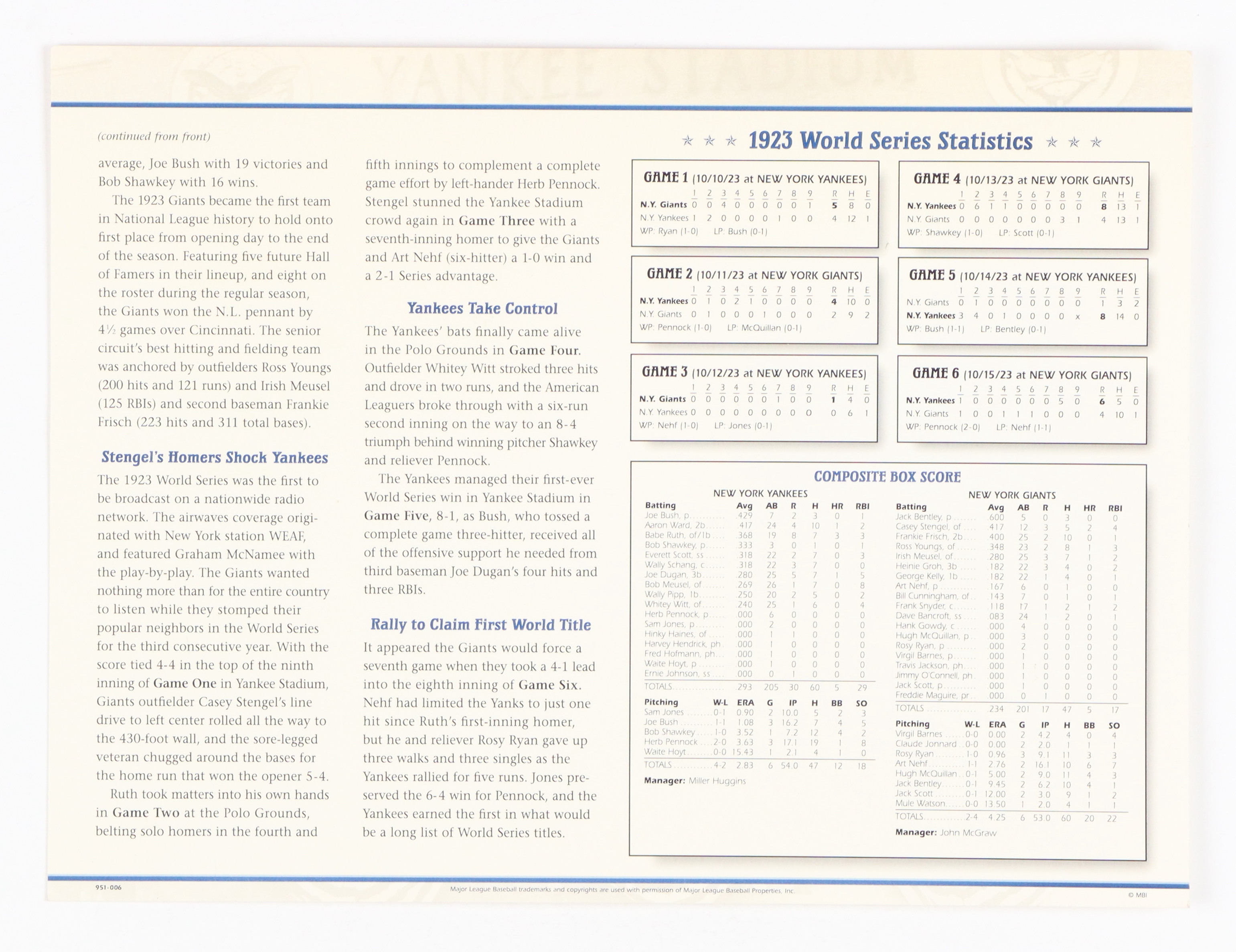 1923 World Series New York Giants vs. New York Yankees display measures approximately 9" x 12". Please note, that the display is not signed.