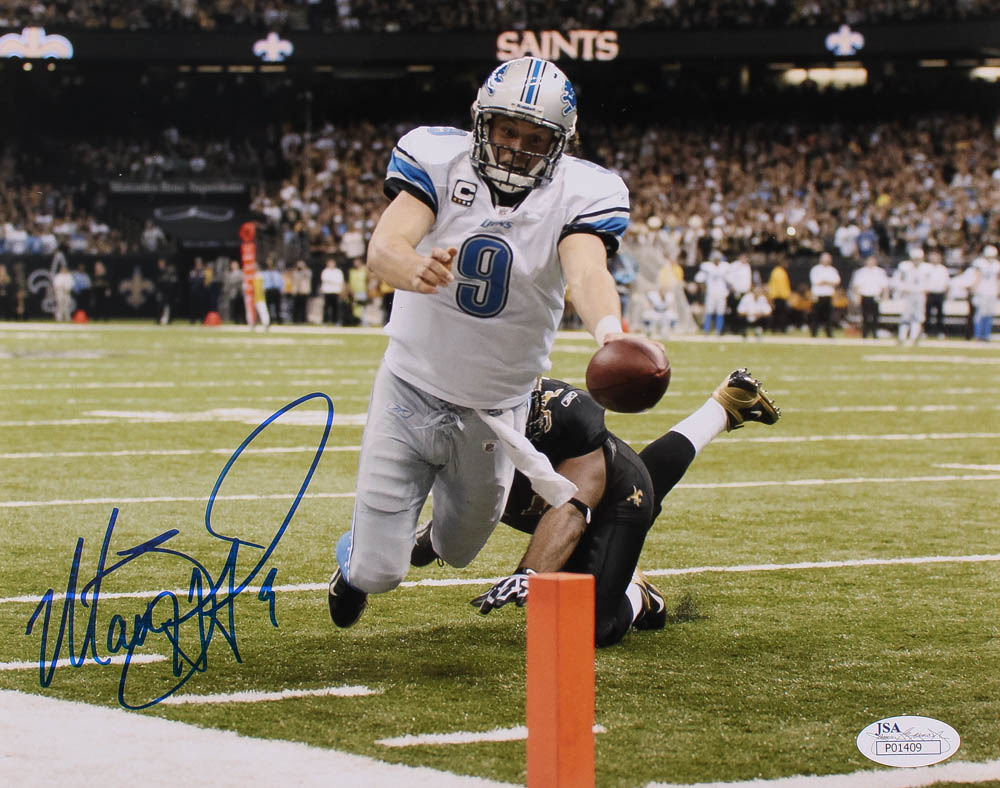 Photo measures 8" x 10" in size and has been hand-signed in blue felt-tip pen by Matthew Stafford.