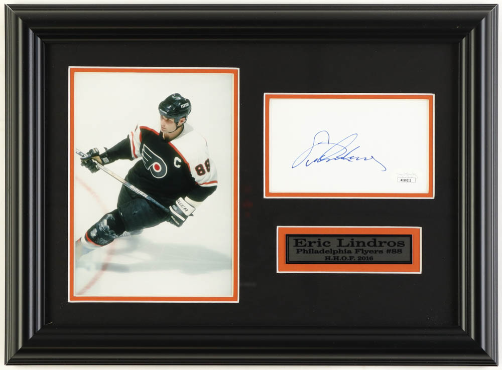 Custom frame measures 11" x 15" in size. Features a cut that has been hand-signed by Eric Lindros (Philadelphia Flyers, HOF).