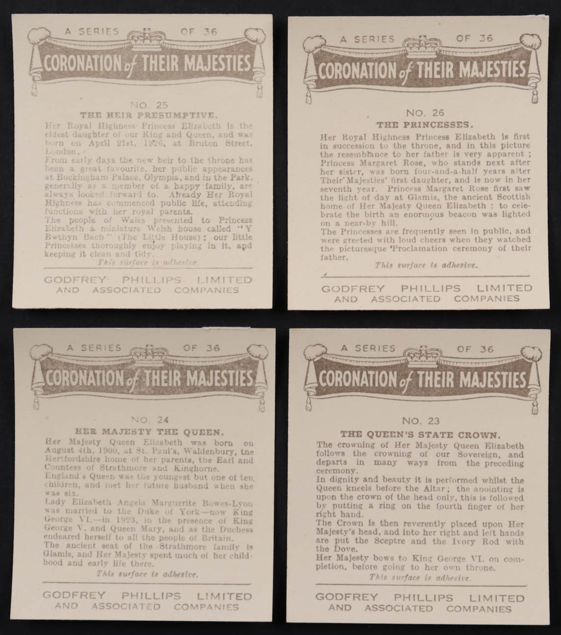 1937 Godfrey Phillips "Coronation of Their Majesties" Complete Set of (36) Cigarette Cards with (2) Princess Elizabeth Cards