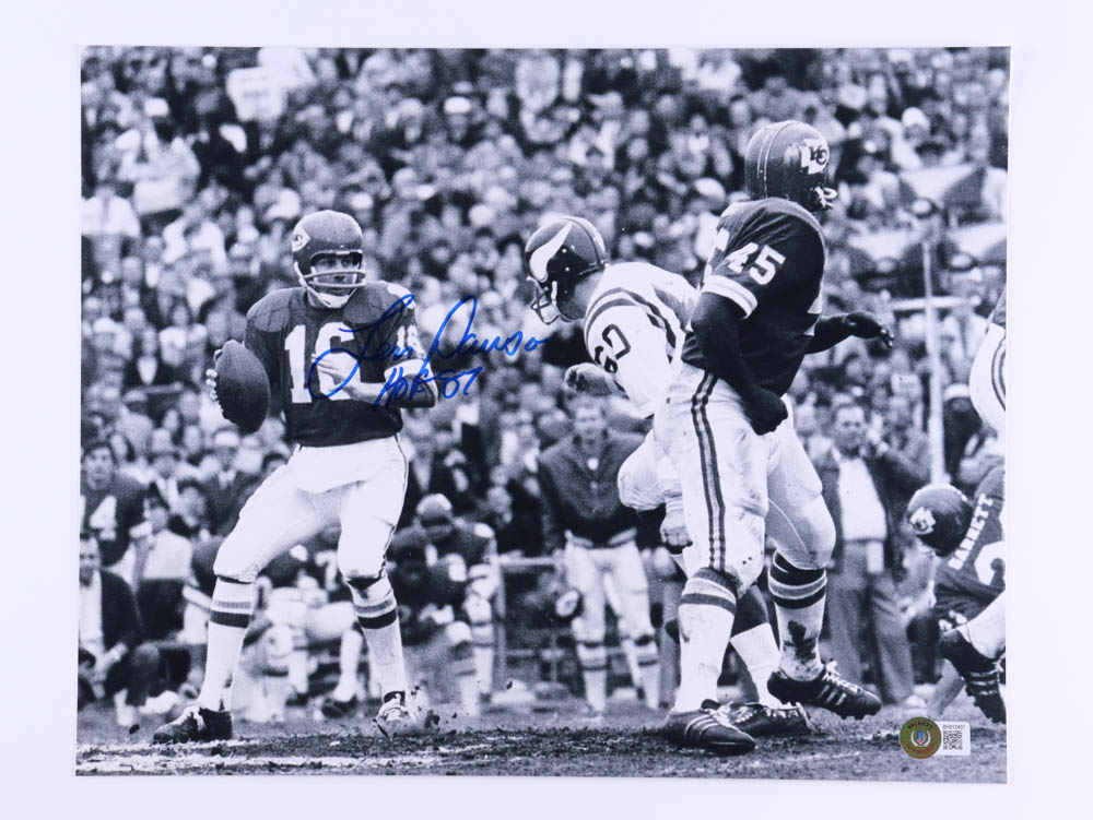 Photo measures 11" x 14" in size and has been hand-signed and inscribed by Len Dawson (D.2022, Kansas City Chiefs, HOF).