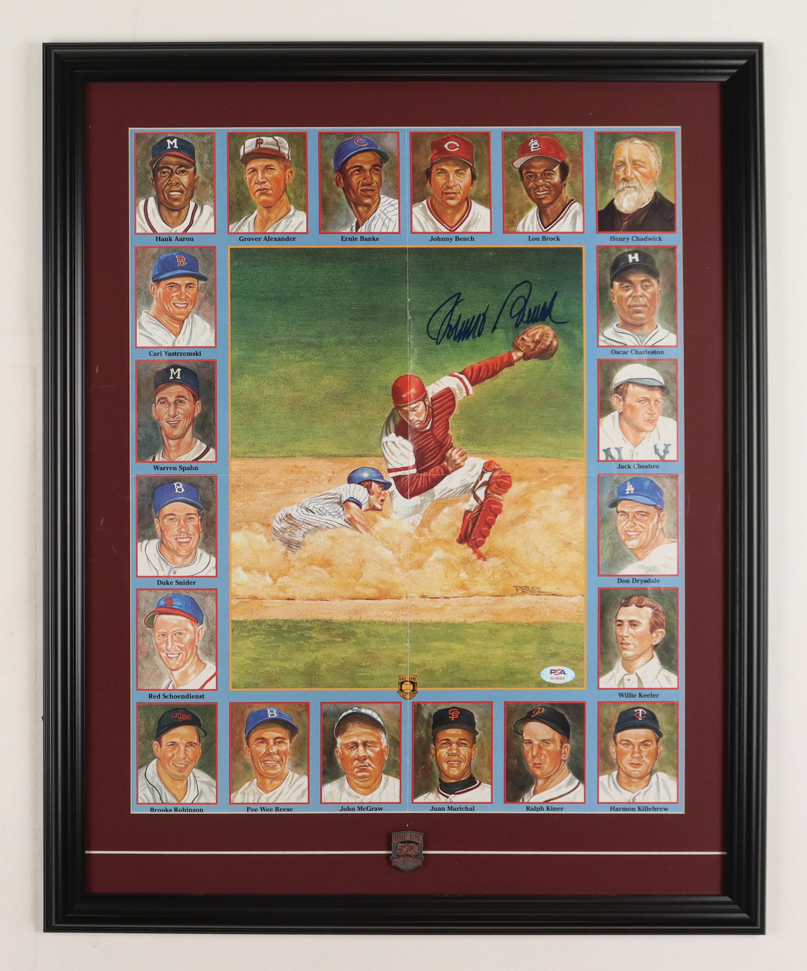 Johnny Bench Signed Hall Of Fame Perez-Steele Art Poster Display with 50th Anniversary Pin (PSA)
