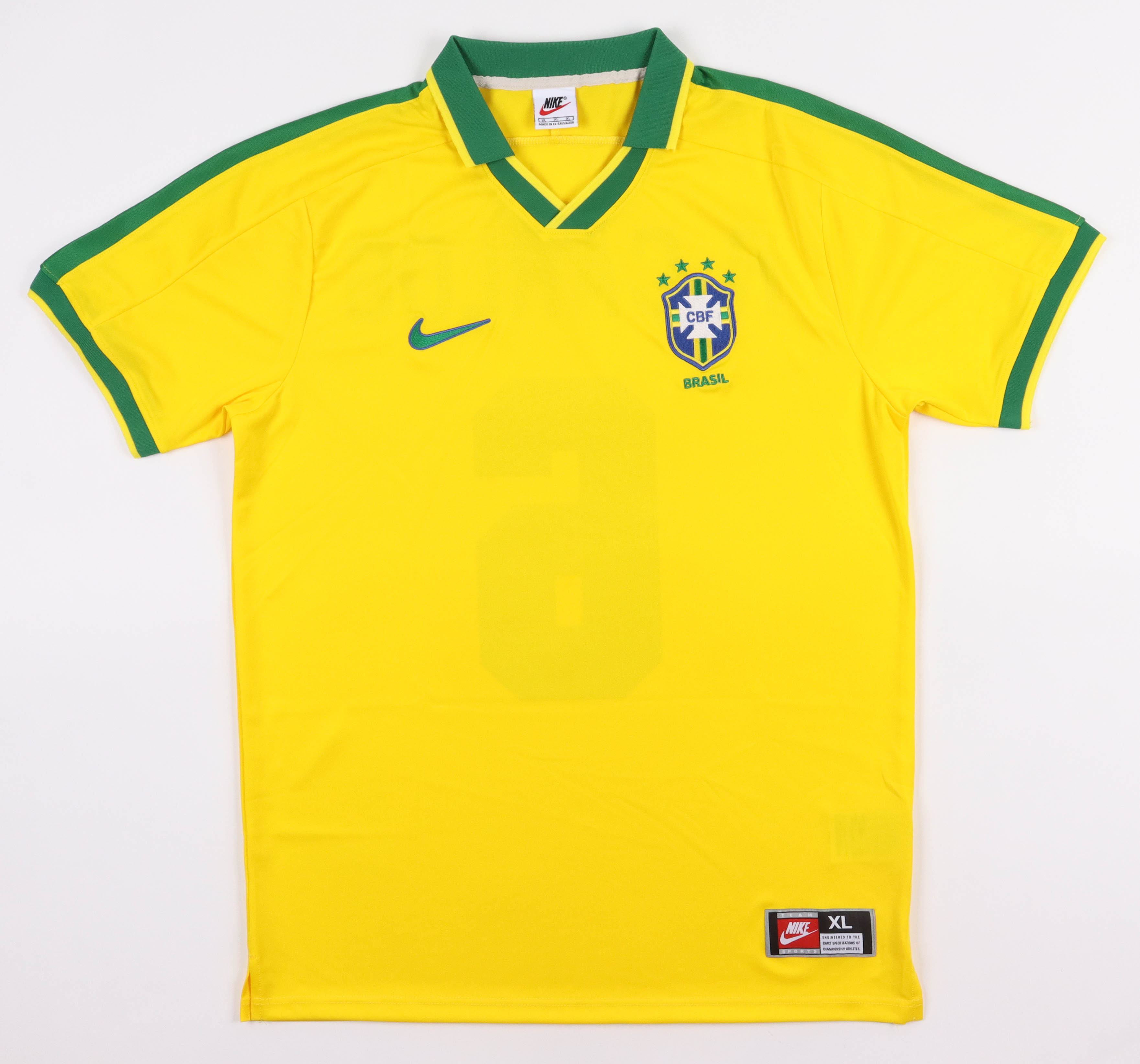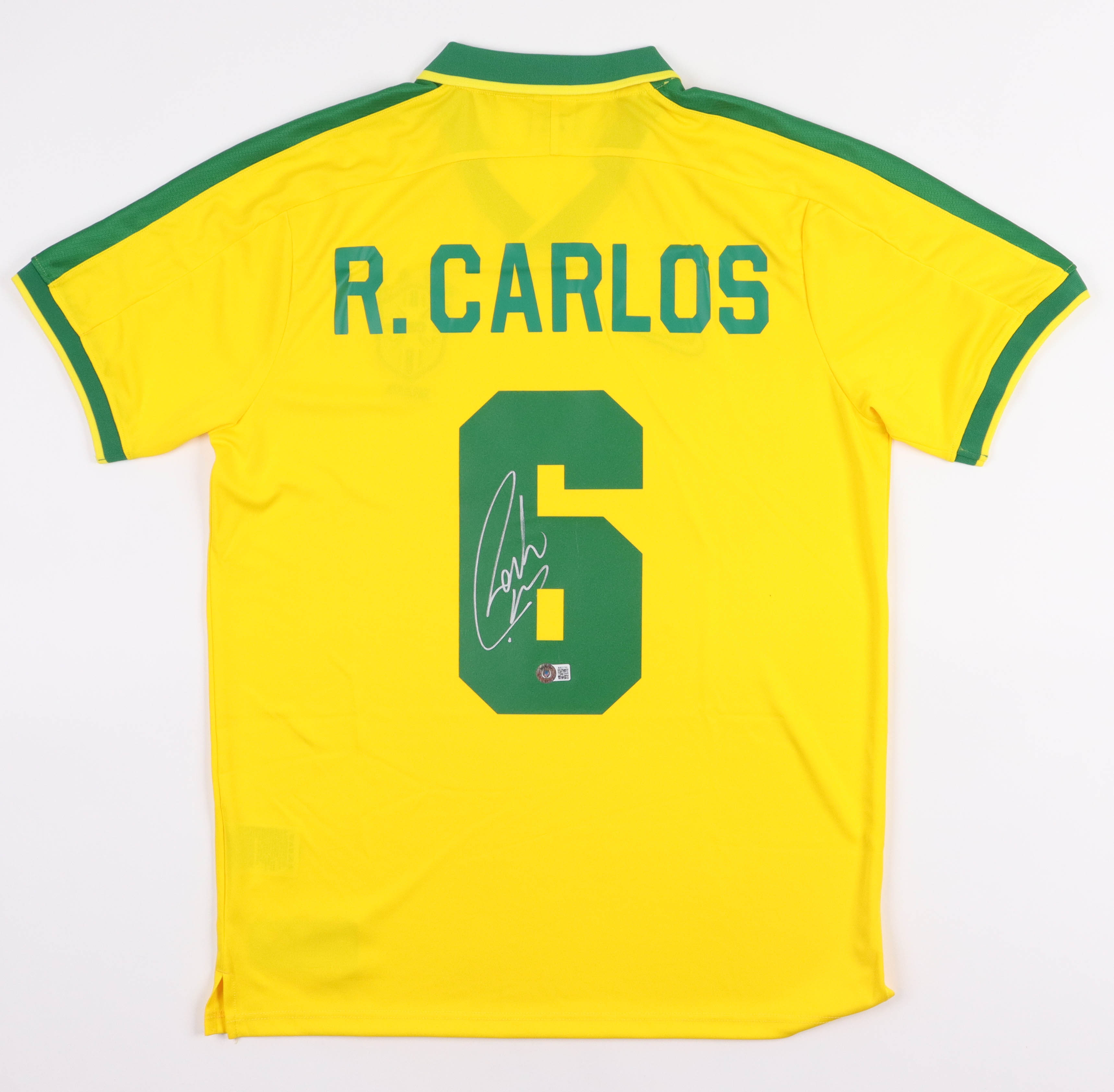 Nike on-field style jersey. Everything is printed on, size XL. Hand signed by Roberto Carlos (Brazil National Team).