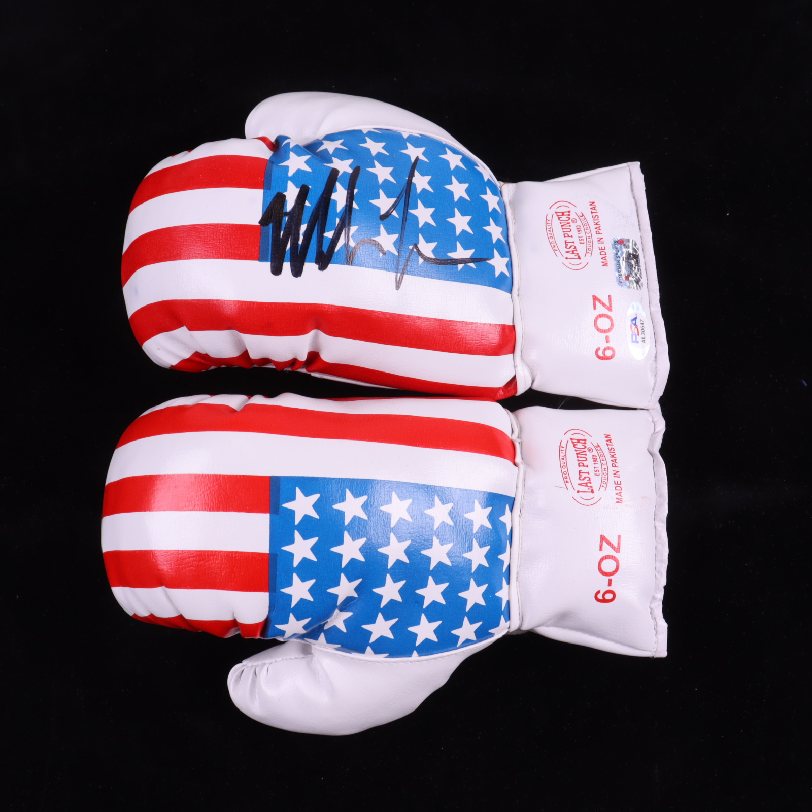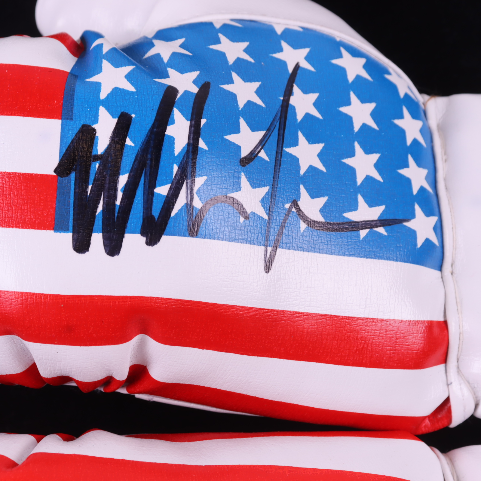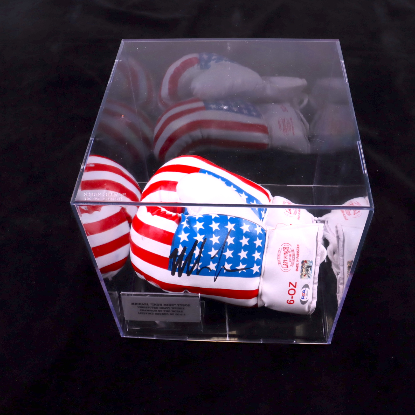 Pair of USA boxing gloves with display case. The left glove has been hand-signed by Mike Tyson (HOF).