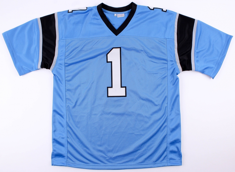 Custom on-field style jersey. Everything sewn on, size XL. Hand-signed in black felt-tip pen by Cam Newton.