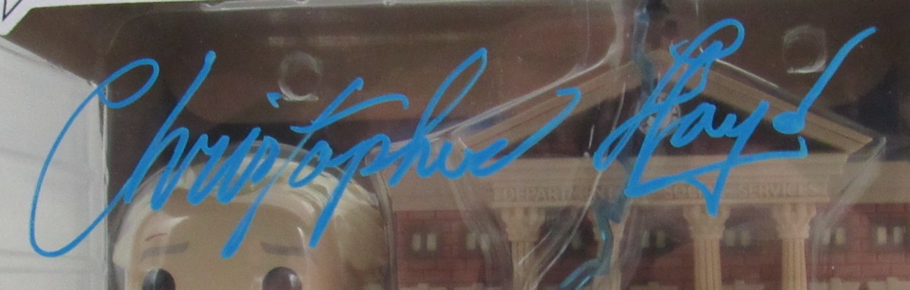 Vinyl figure measures approximately 4" tall and comes in original packaging. Hand-signed on the box by Christopher Lloyd.