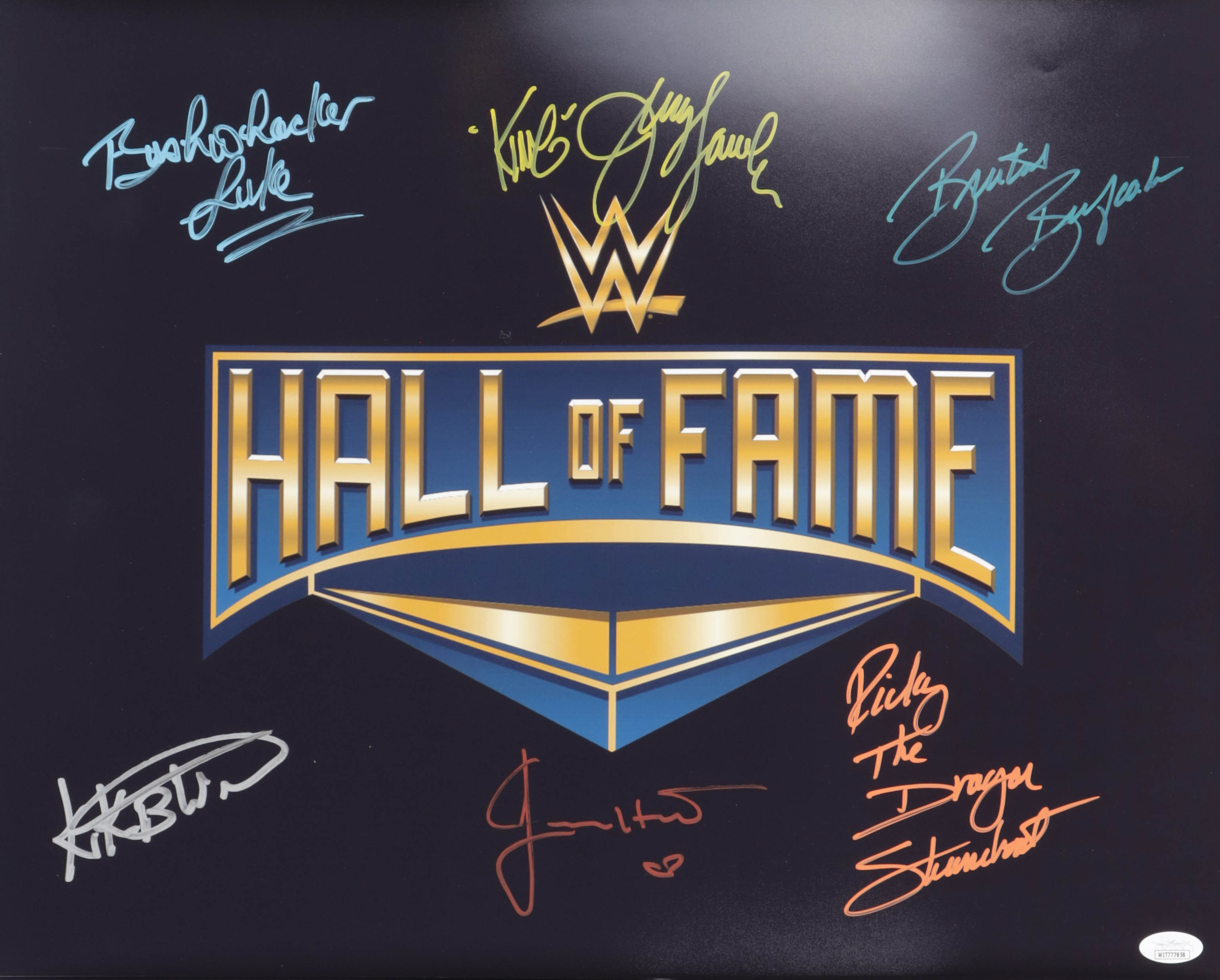 WWE Hall of Fame 16x20 Photo Signed by (6) with Jerry Lawler, Ricky "The Dragon" Steamboat, Jimmy Hart, Brutus Beefcake (JSA)