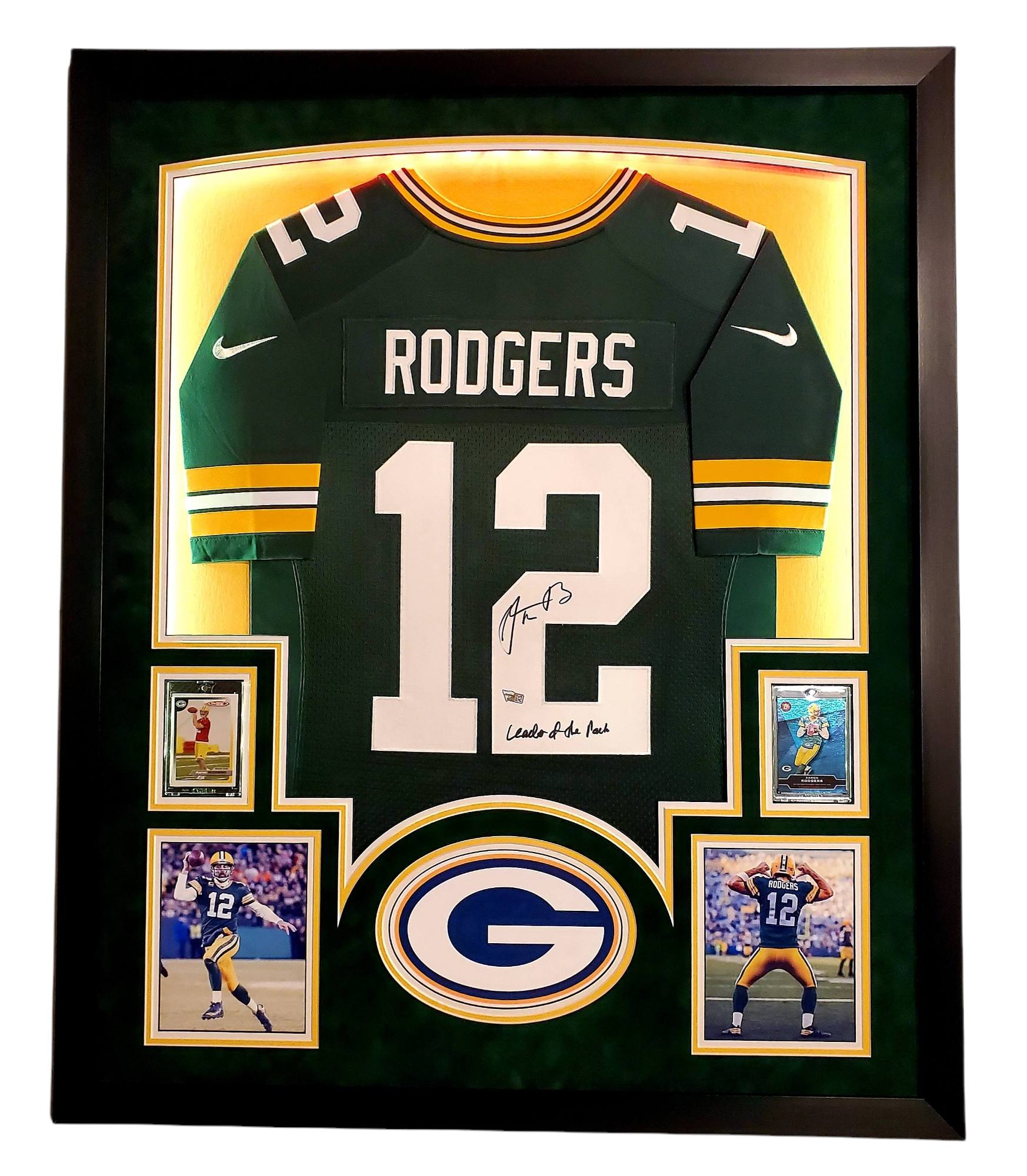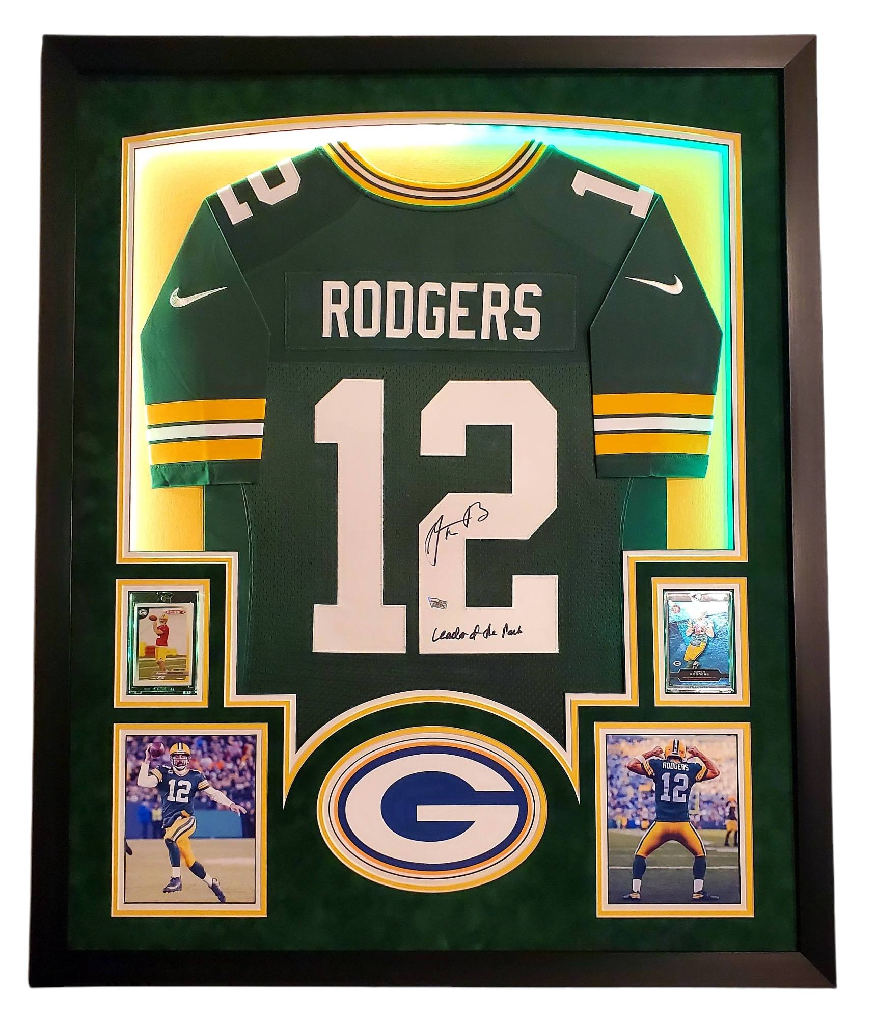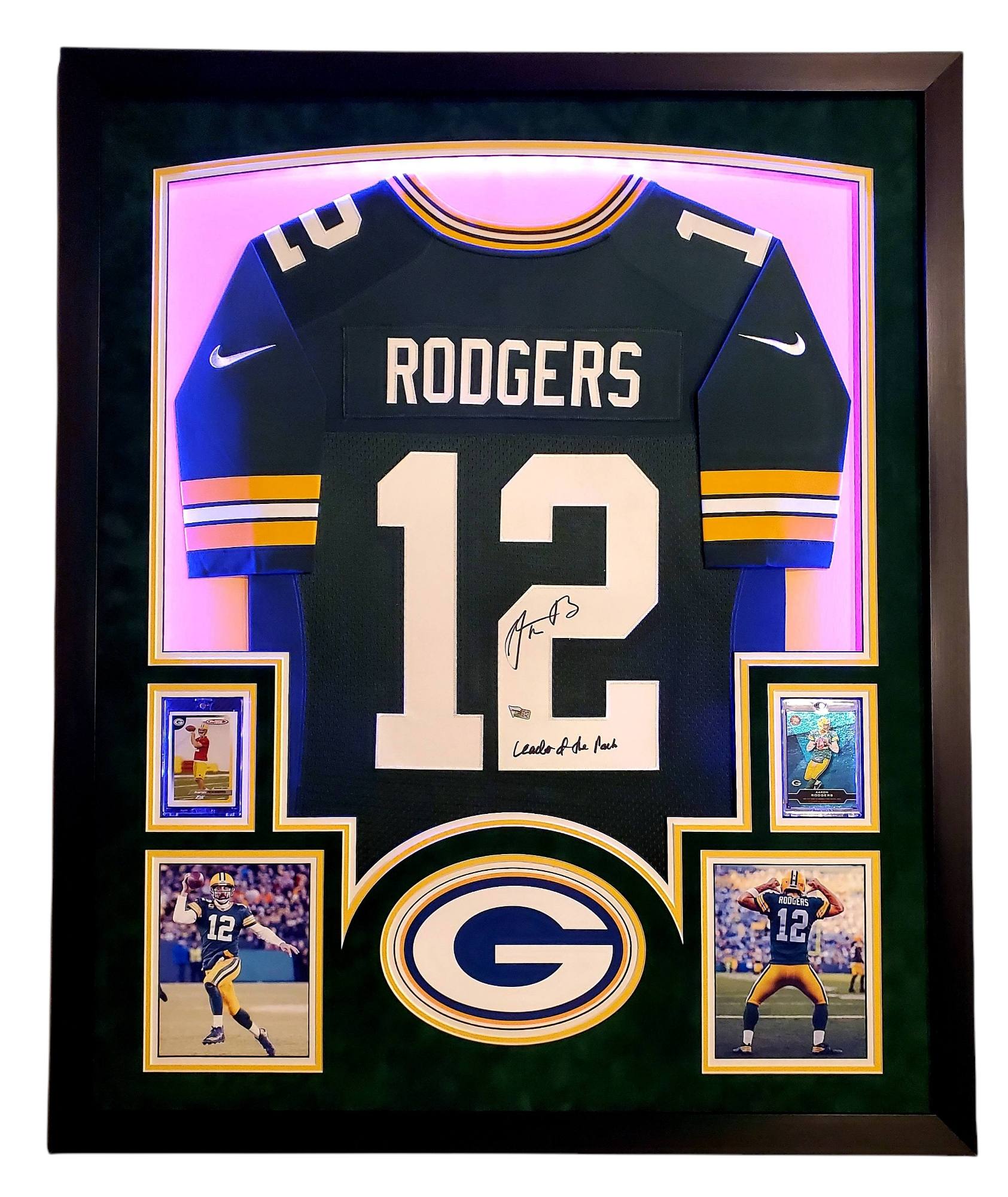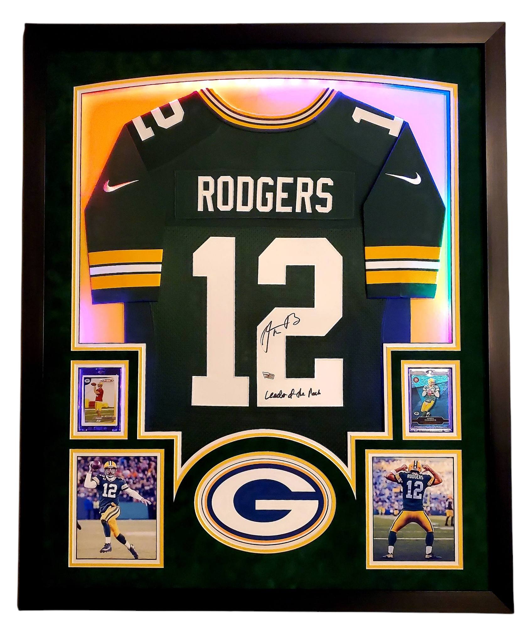 Aaron Rodgers Signed Packers 34x42 Custom Framed Jersey Display with LED Lights Inscribed "Leader of the Pack" (Fanatics)