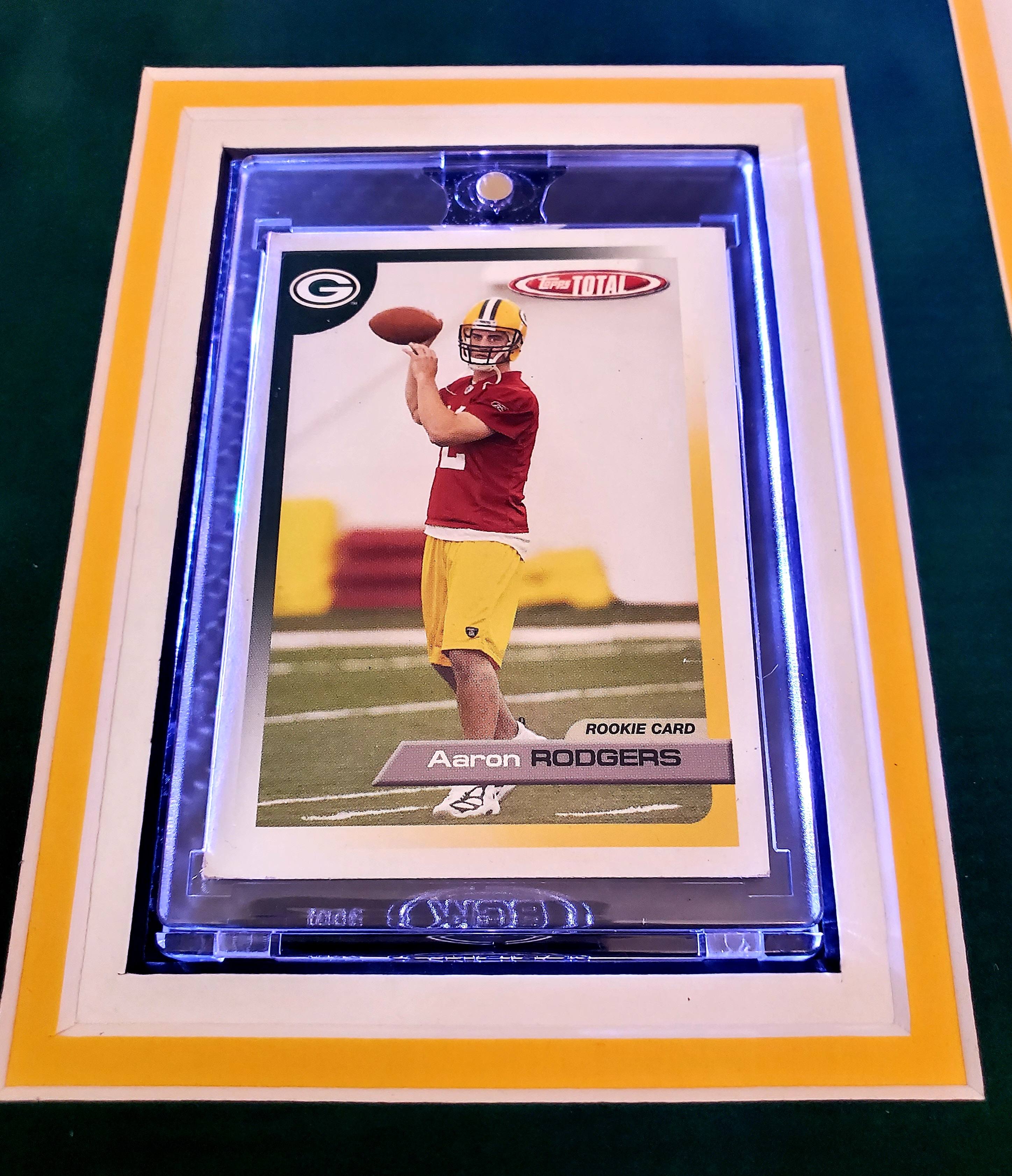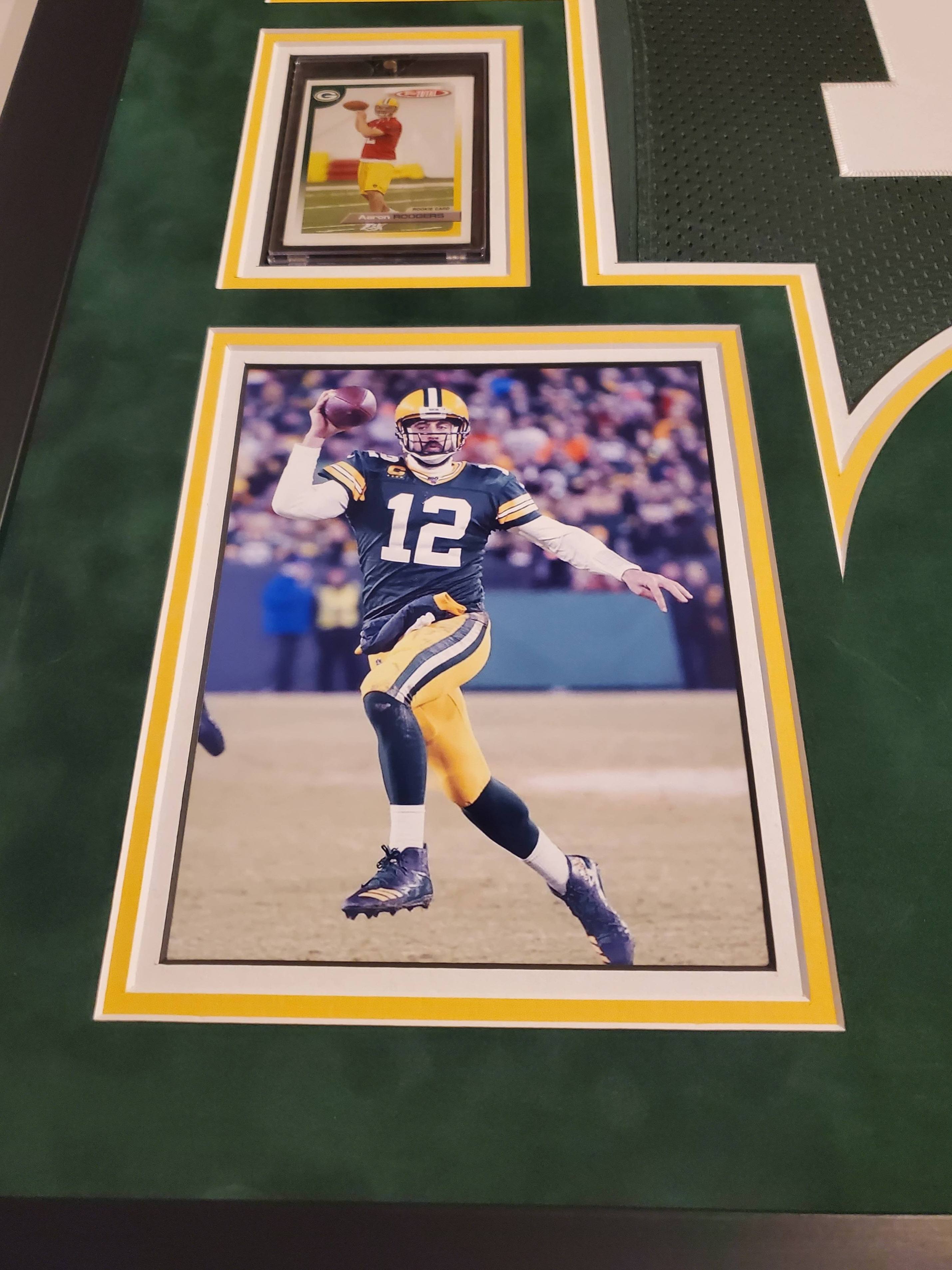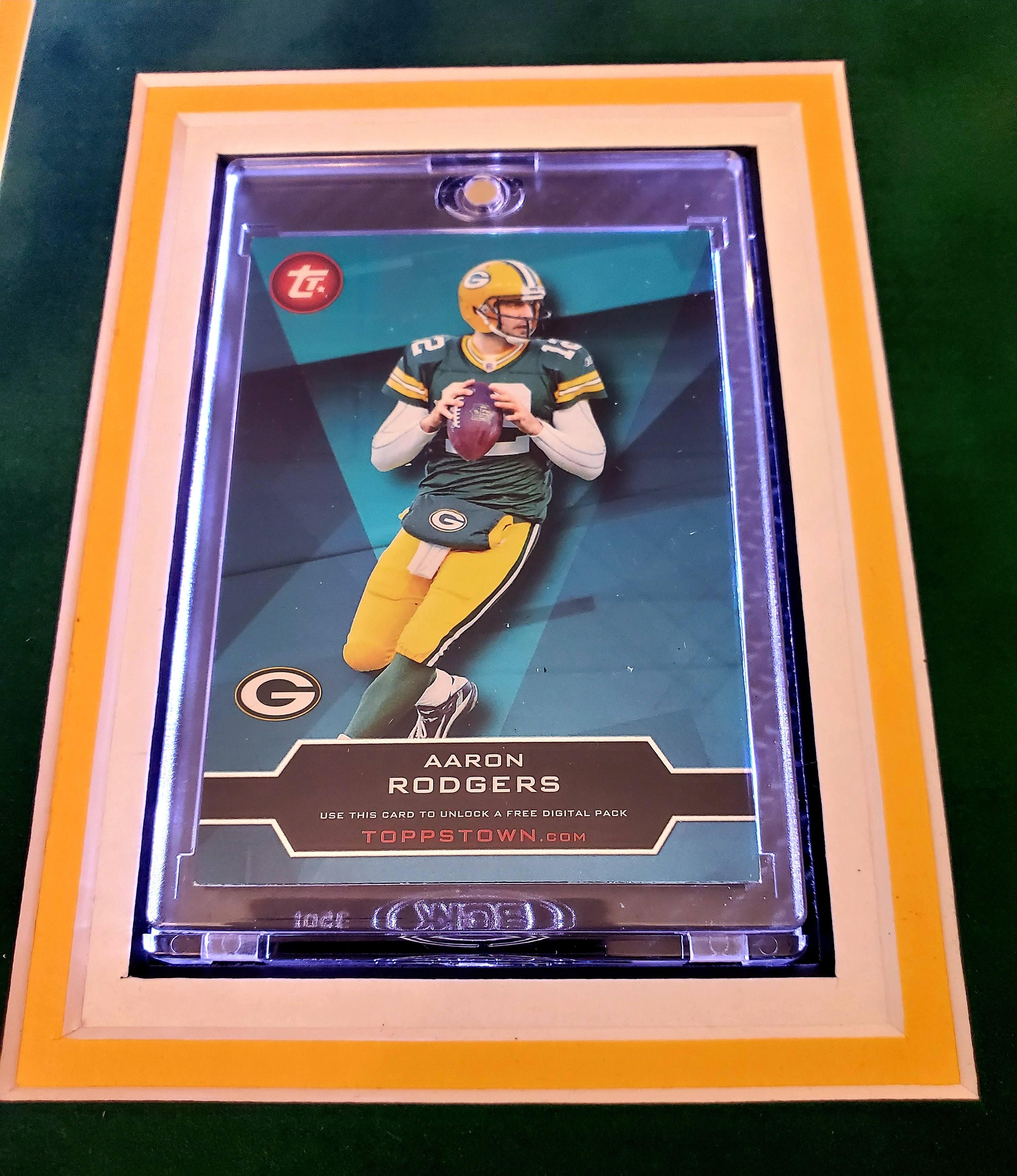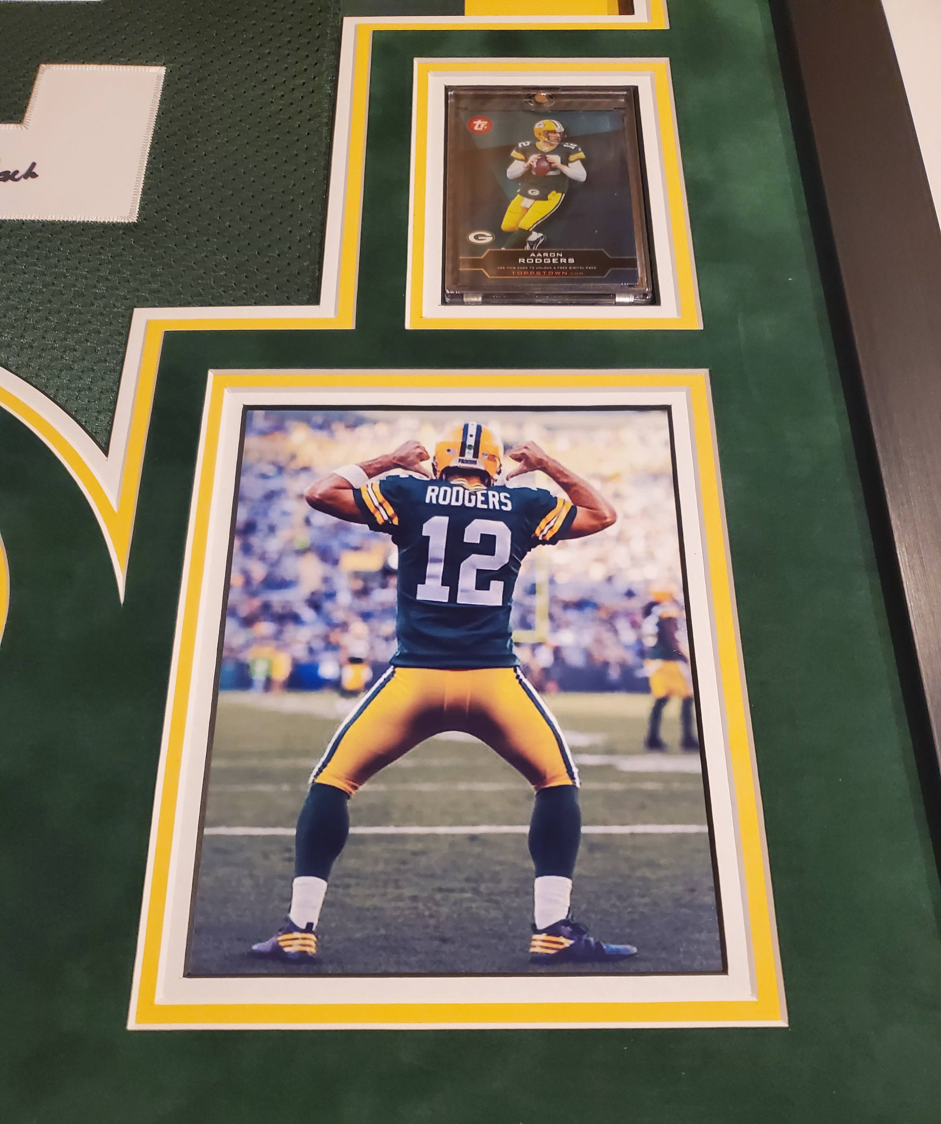 Custom frame measures 34" x 42" in size and features an Authentic Nike Elite jersey that has been hand-signed and inscribed by Aaron Rodgers (Green Bay Packers). Display also includes a Aaron Rodgers 2005 Topps Total #483 RC and an Aaron Rodgers 2011 Topps Topps Town #TT1.