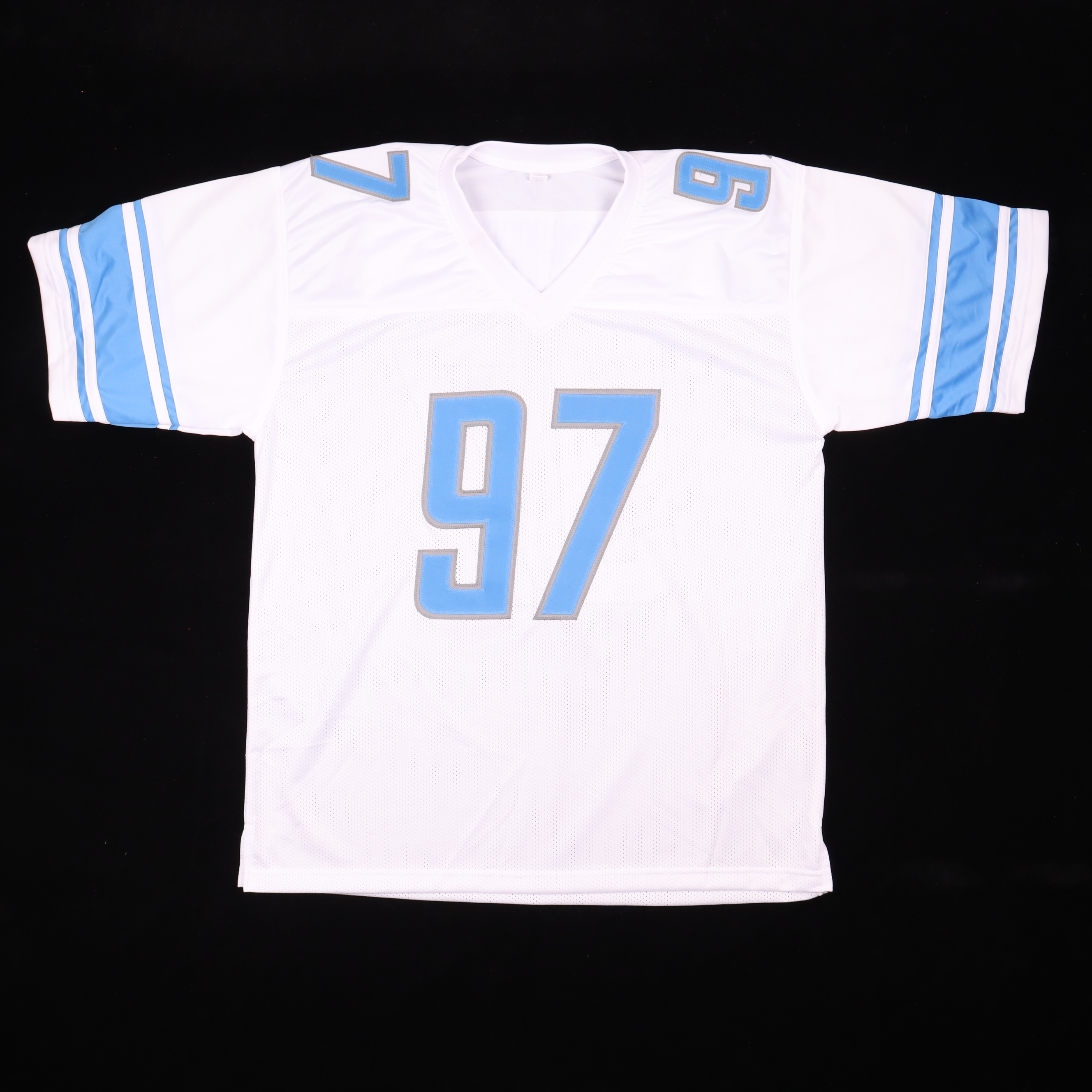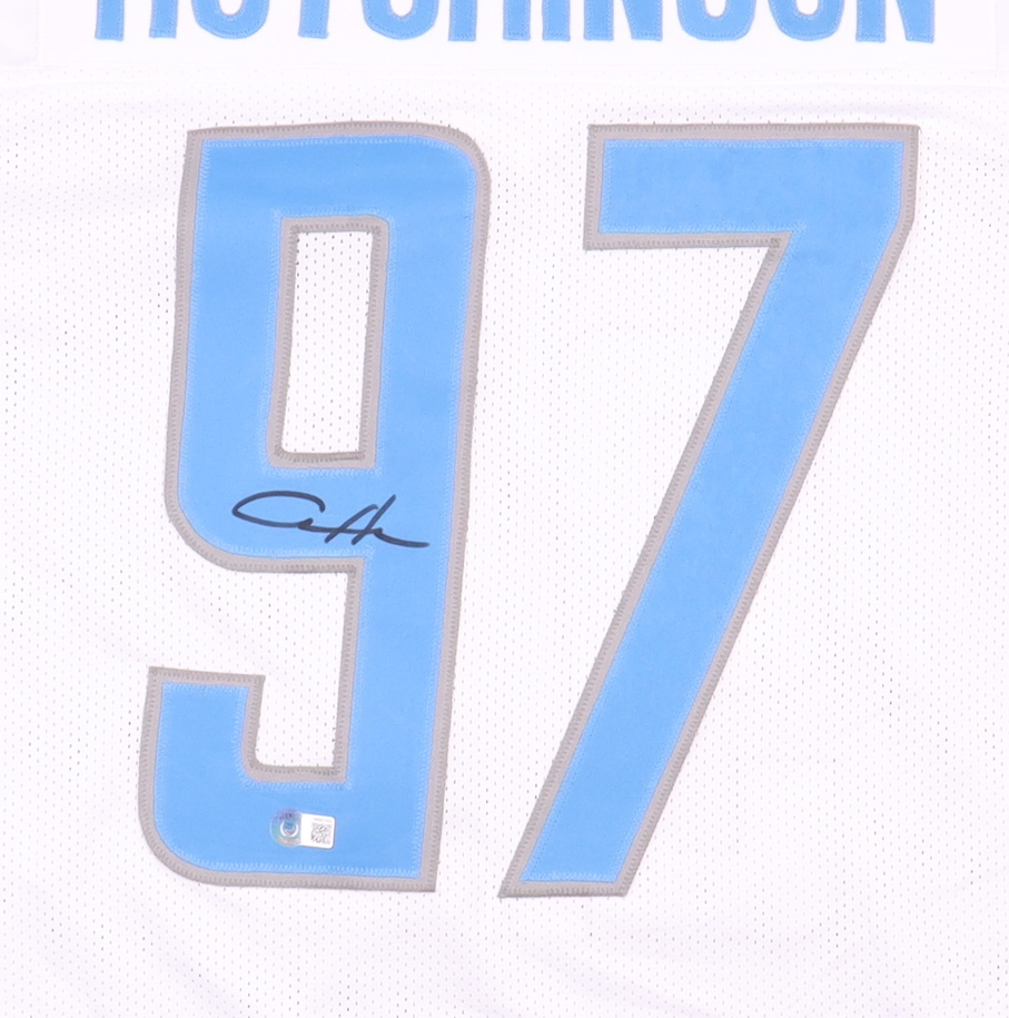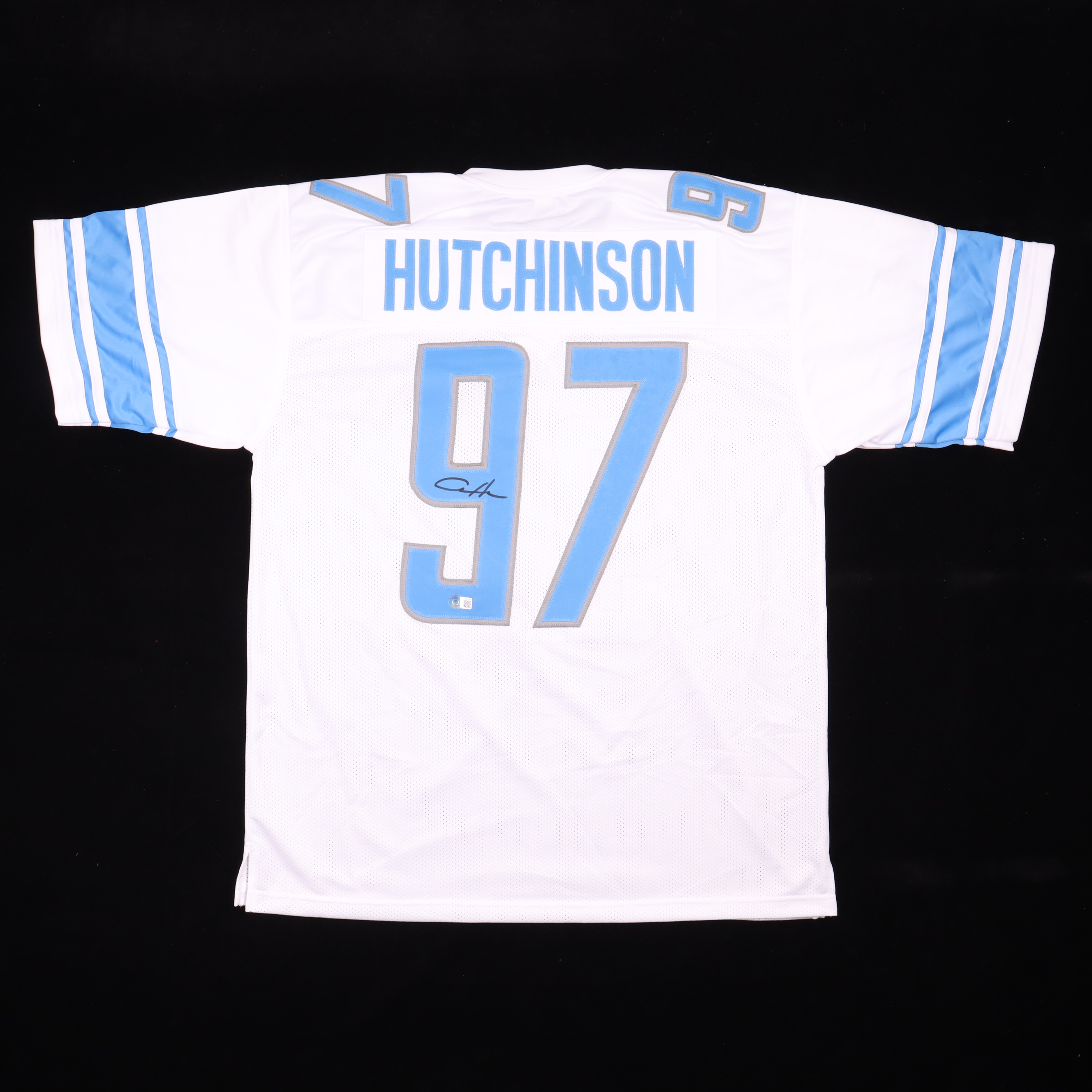Custom on-field style jersey. Everything is sewn on, size XL. Hand-signed by Aidan Hutchinson.